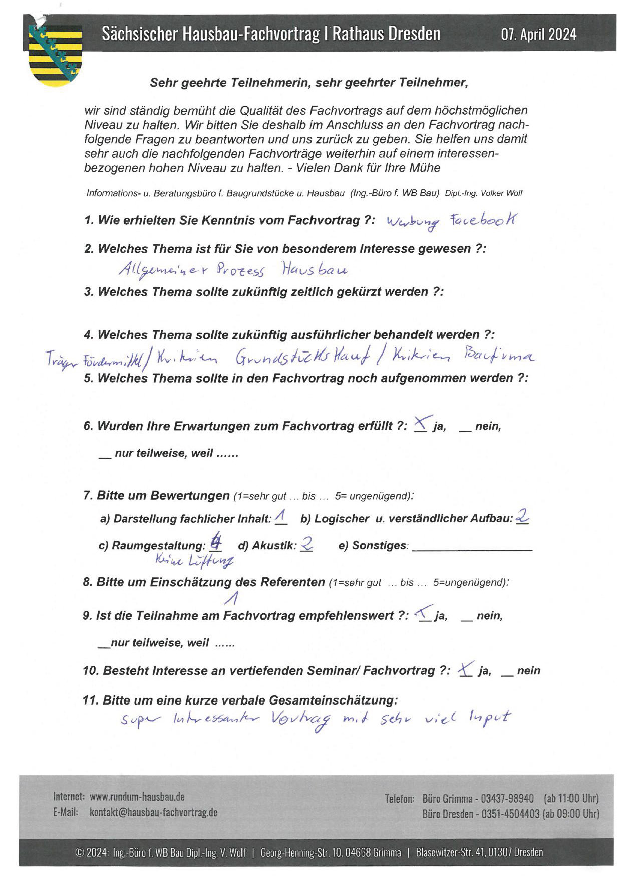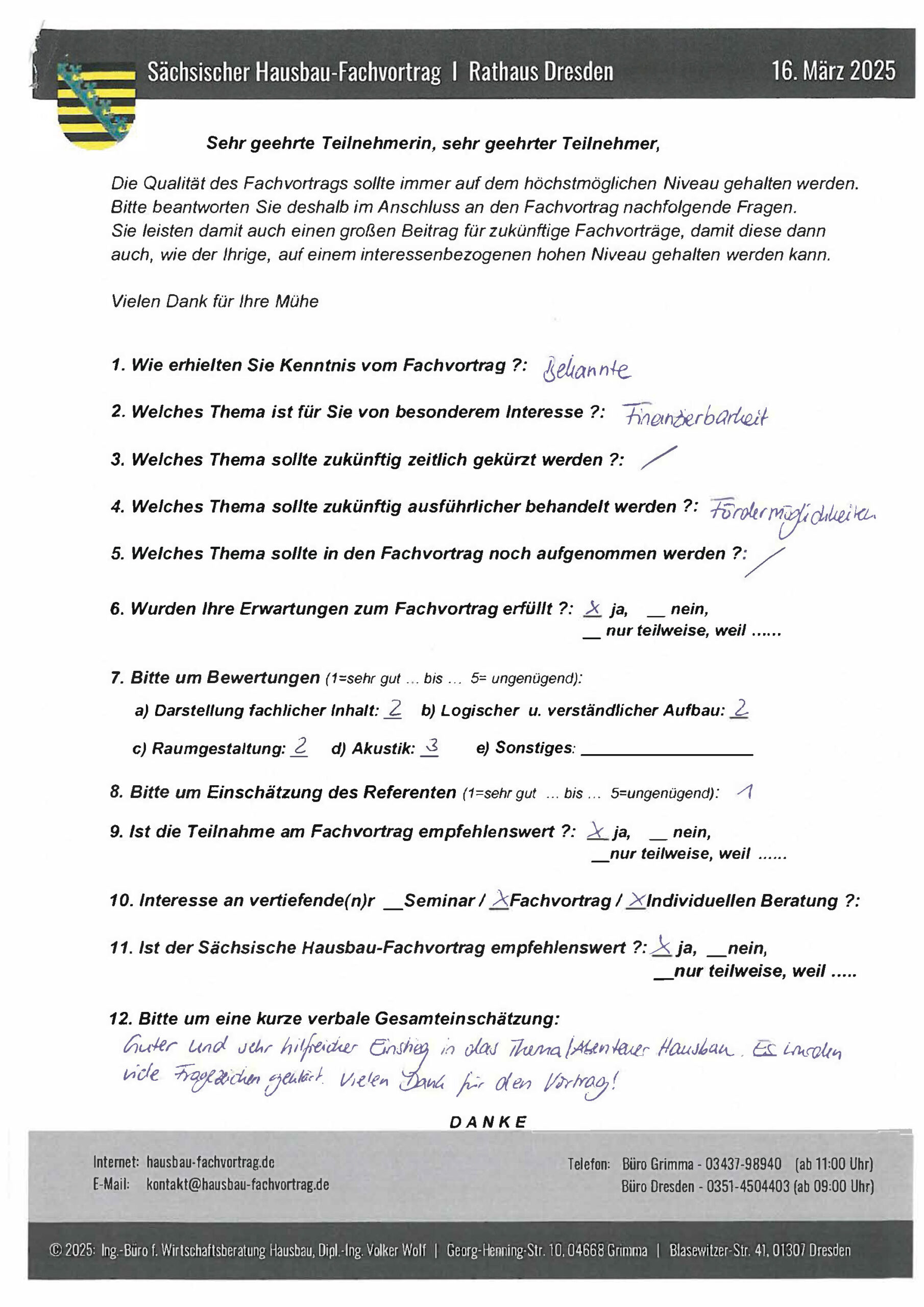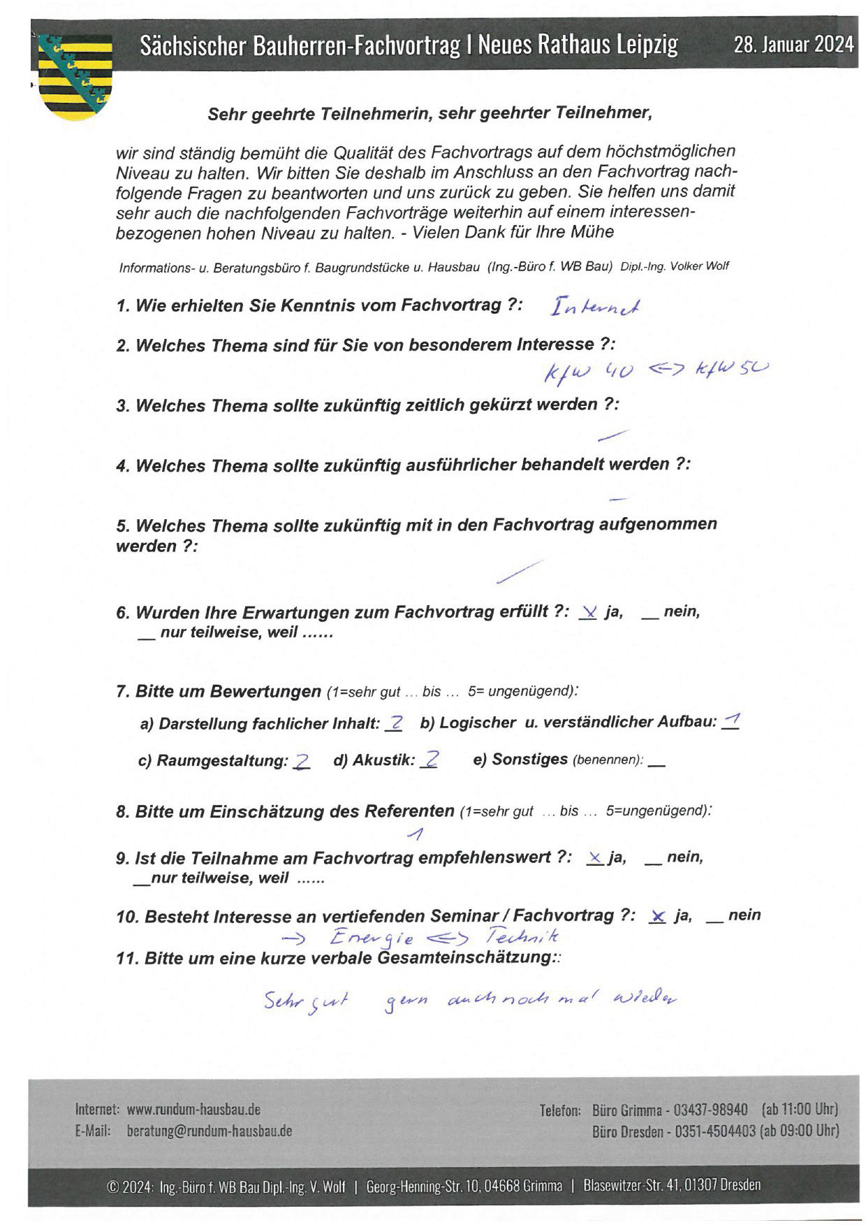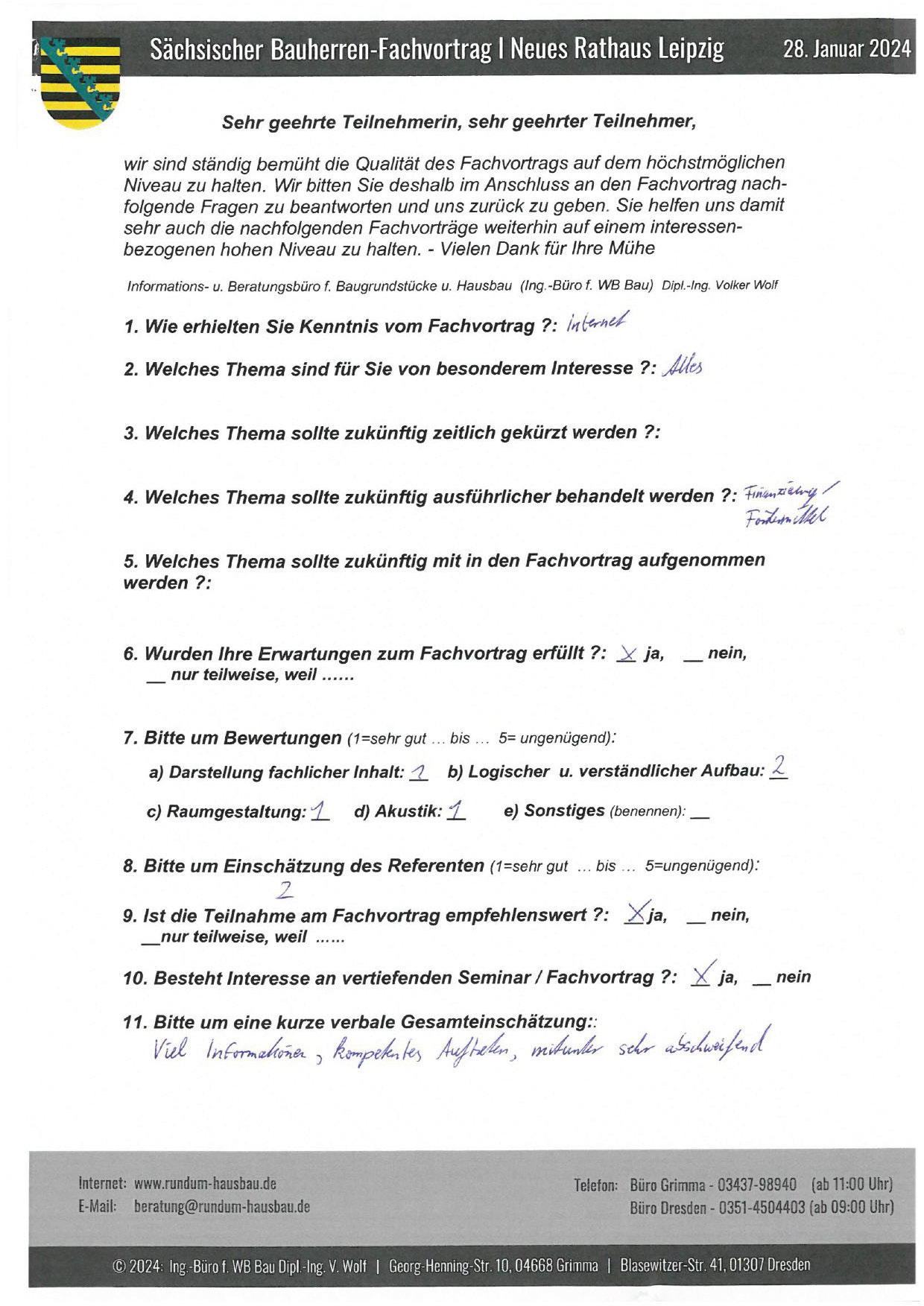 Den Hausbau-Fachvortrag von Herrn Dipl.-Ing. V. Wolf besuchte ich im März 2003 im Leipziger Rathaus. Der Andrang war so groß, dass zusätzliche Stühle aufgestellt werden mussten. Gleich am Anfang wurde mit den Teilnehmern abgestimmt, welche Themen intensiver behandelt werden sollen. Da ich ohne Vorkenntnisse die Veranstaltung besuchte, waren für mich die meisten Themen interessant.