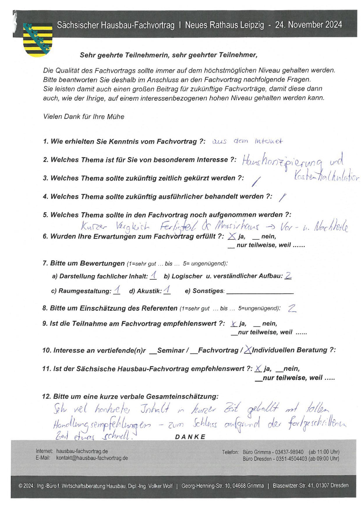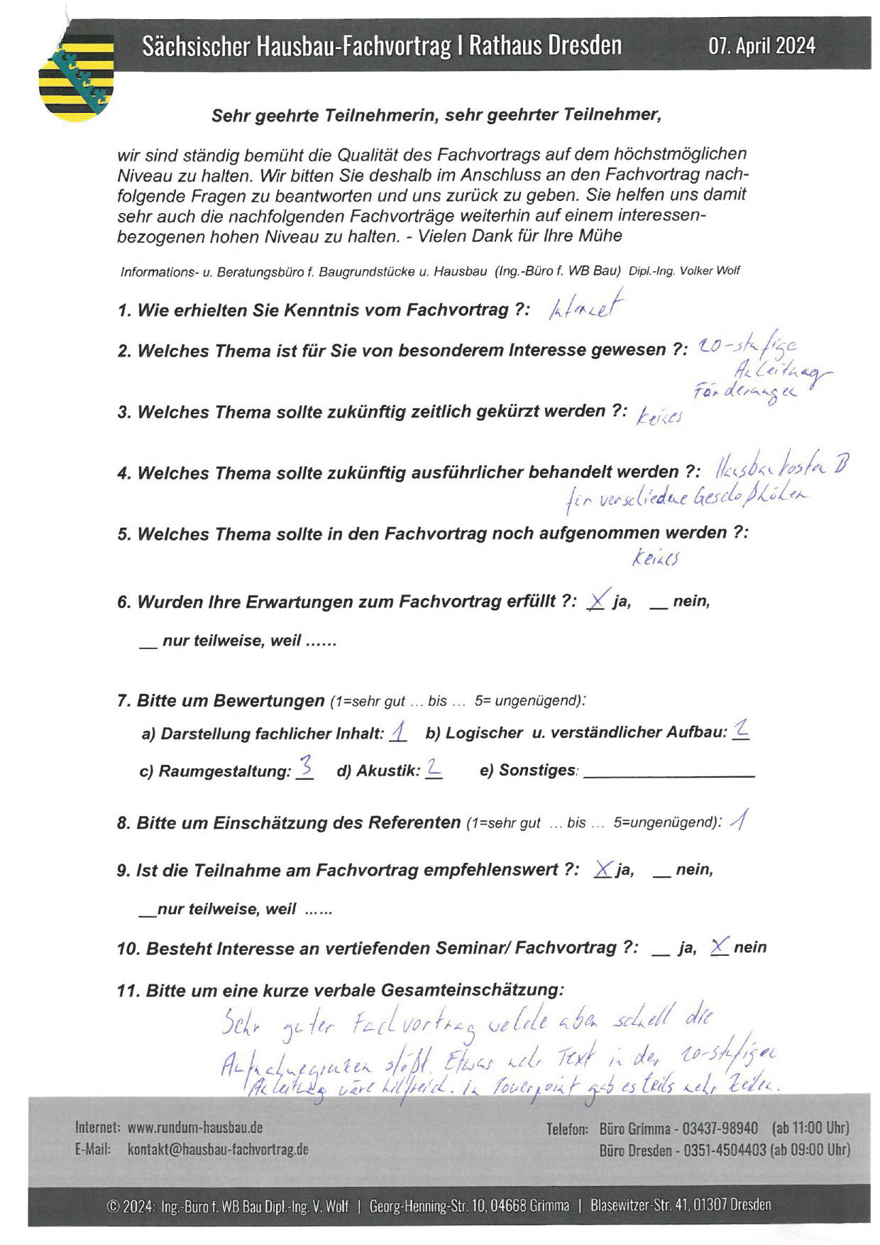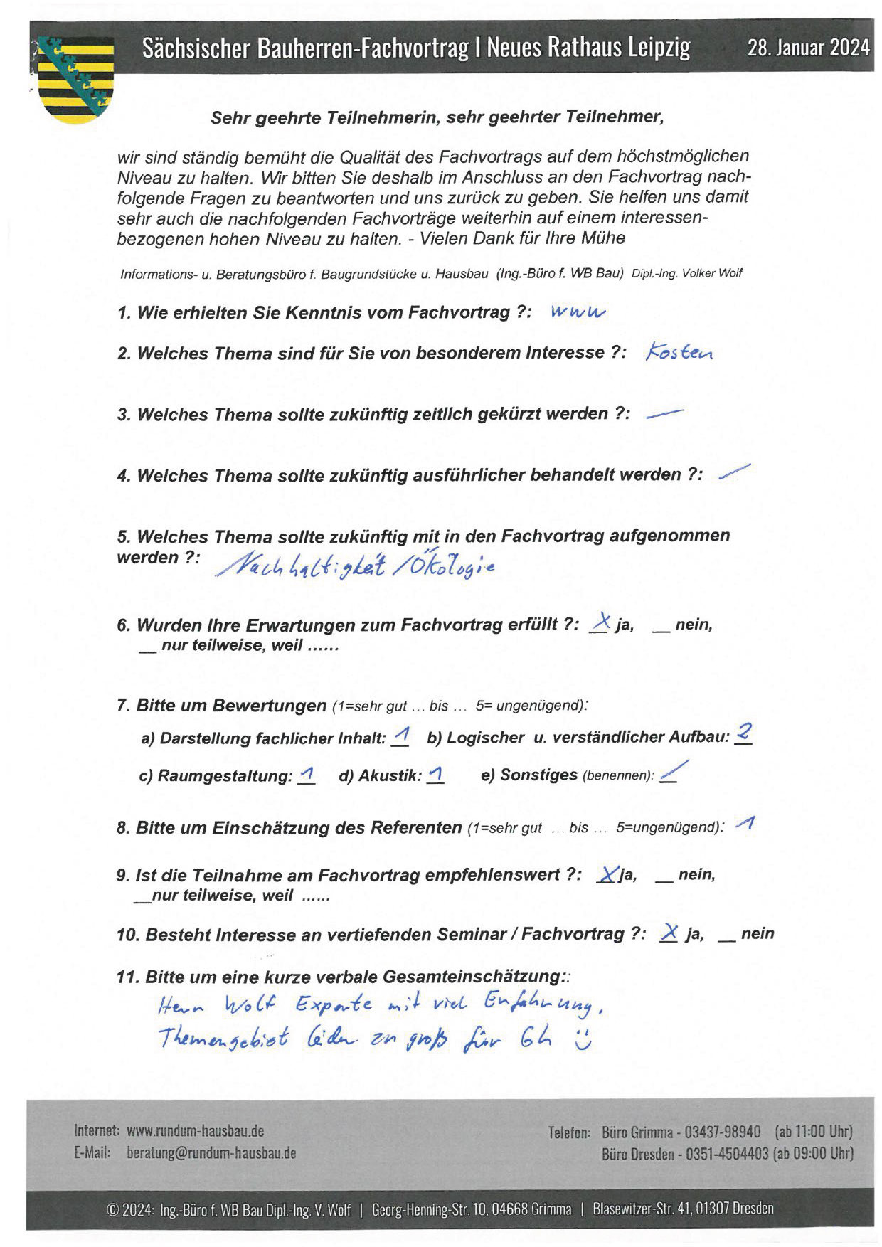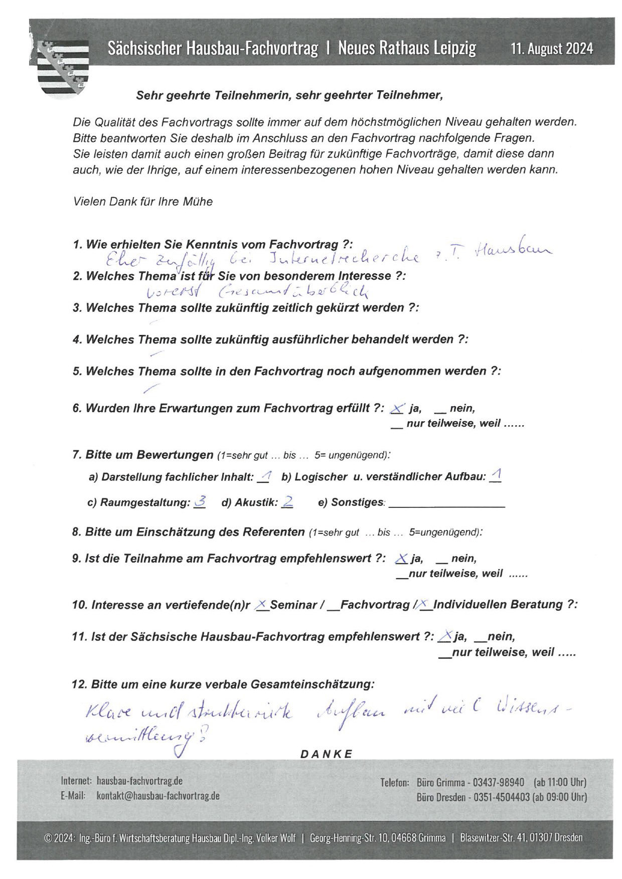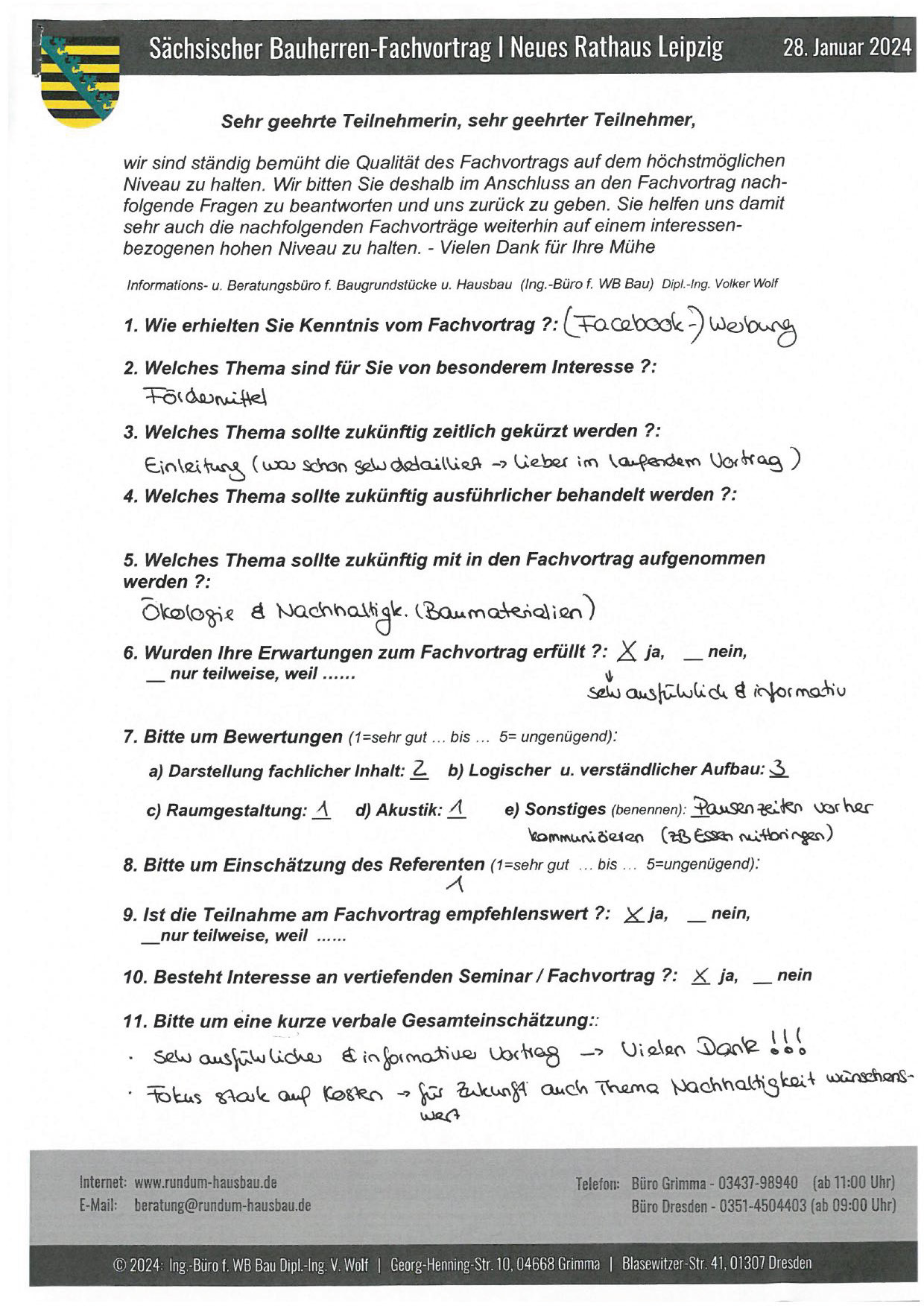 Den Hausbau-Fachvortrag von Herrn Dipl.-Ing. V. Wolf besuchte ich im März 2003 im Leipziger Rathaus. Der Andrang war so groß, dass zusätzliche Stühle aufgestellt werden mussten. Gleich am Anfang wurde mit den Teilnehmern abgestimmt, welche Themen intensiver behandelt werden sollen. Da ich ohne Vorkenntnisse die Veranstaltung besuchte, waren für mich die meisten Themen interessant.