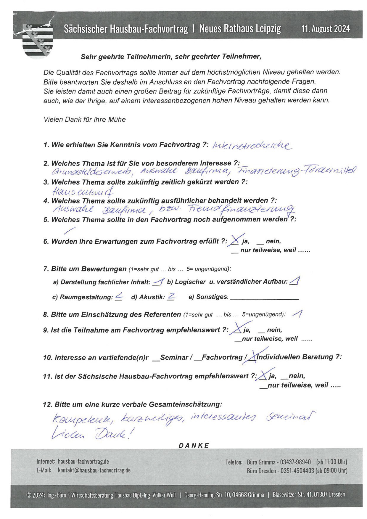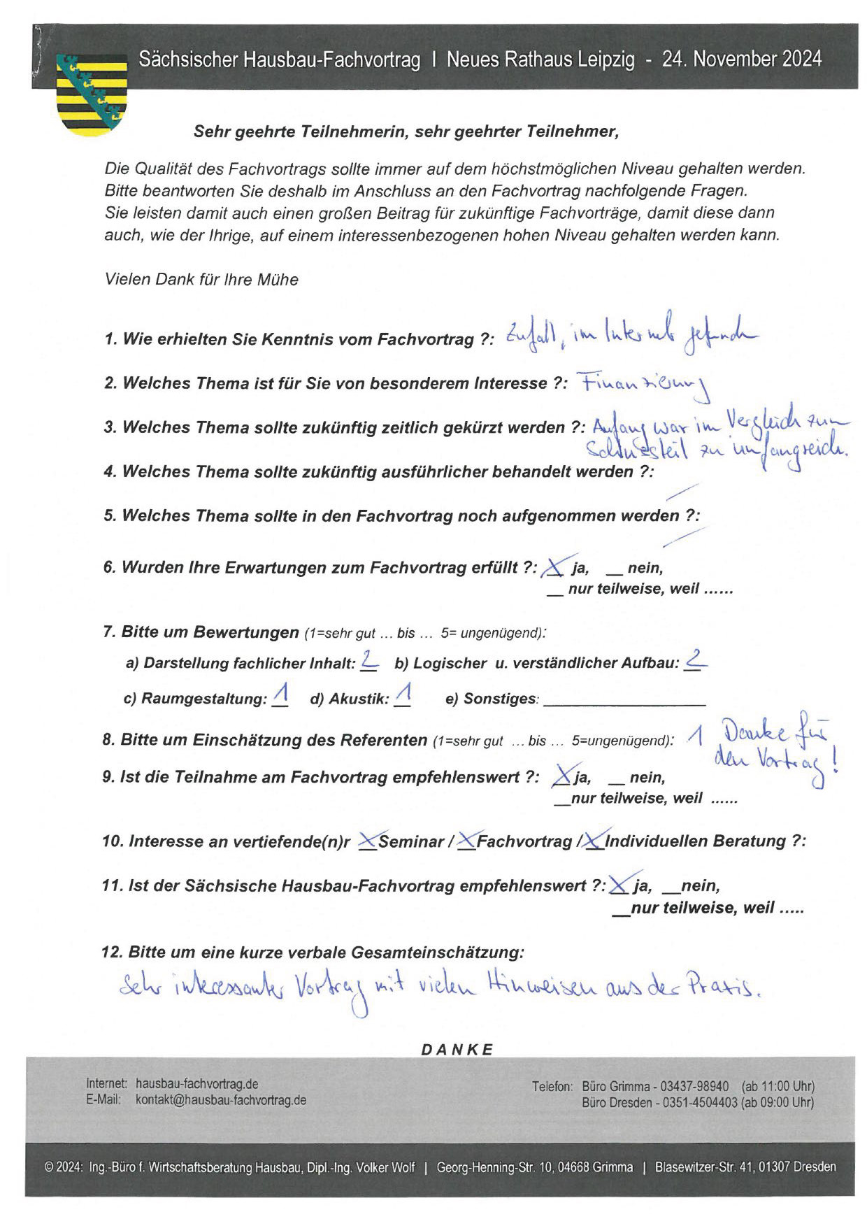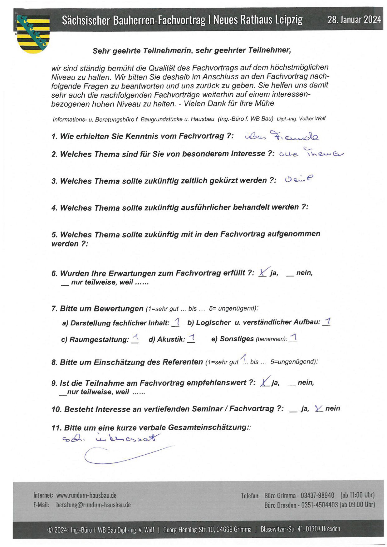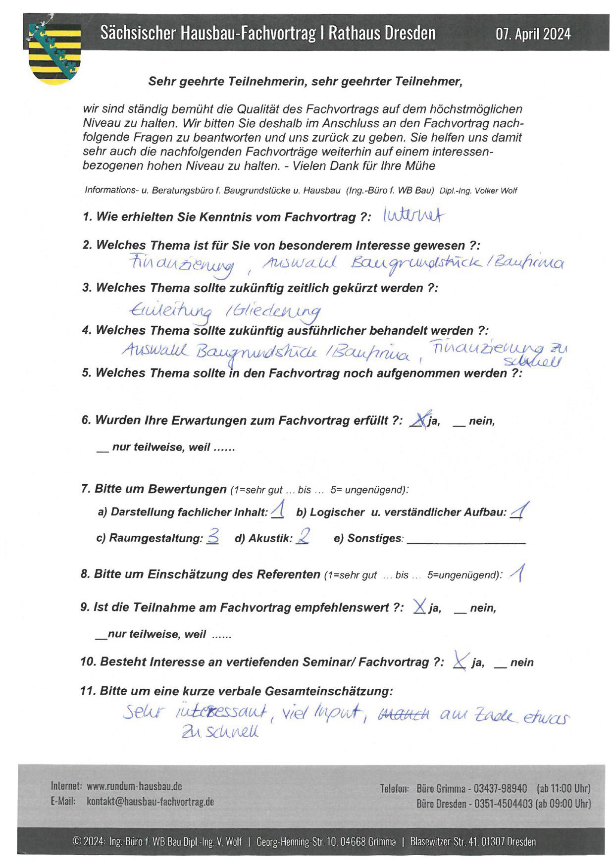 Den Hausbau-Fachvortrag von Herrn Dipl.-Ing. V. Wolf besuchte ich im März 2003 im Leipziger Rathaus. Der Andrang war so groß, dass zusätzliche Stühle aufgestellt werden mussten. Gleich am Anfang wurde mit den Teilnehmern abgestimmt, welche Themen intensiver behandelt werden sollen. Da ich ohne Vorkenntnisse die Veranstaltung besuchte, waren für mich die meisten Themen interessant.