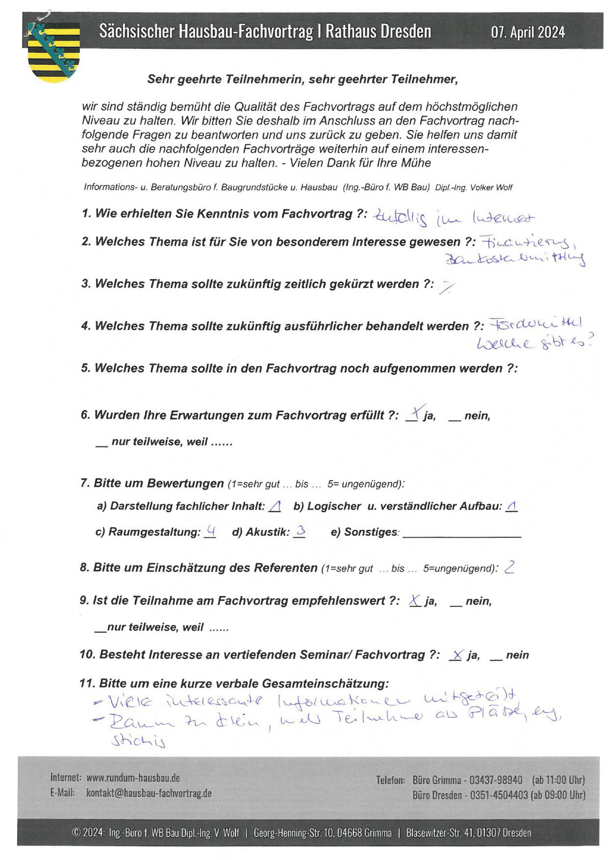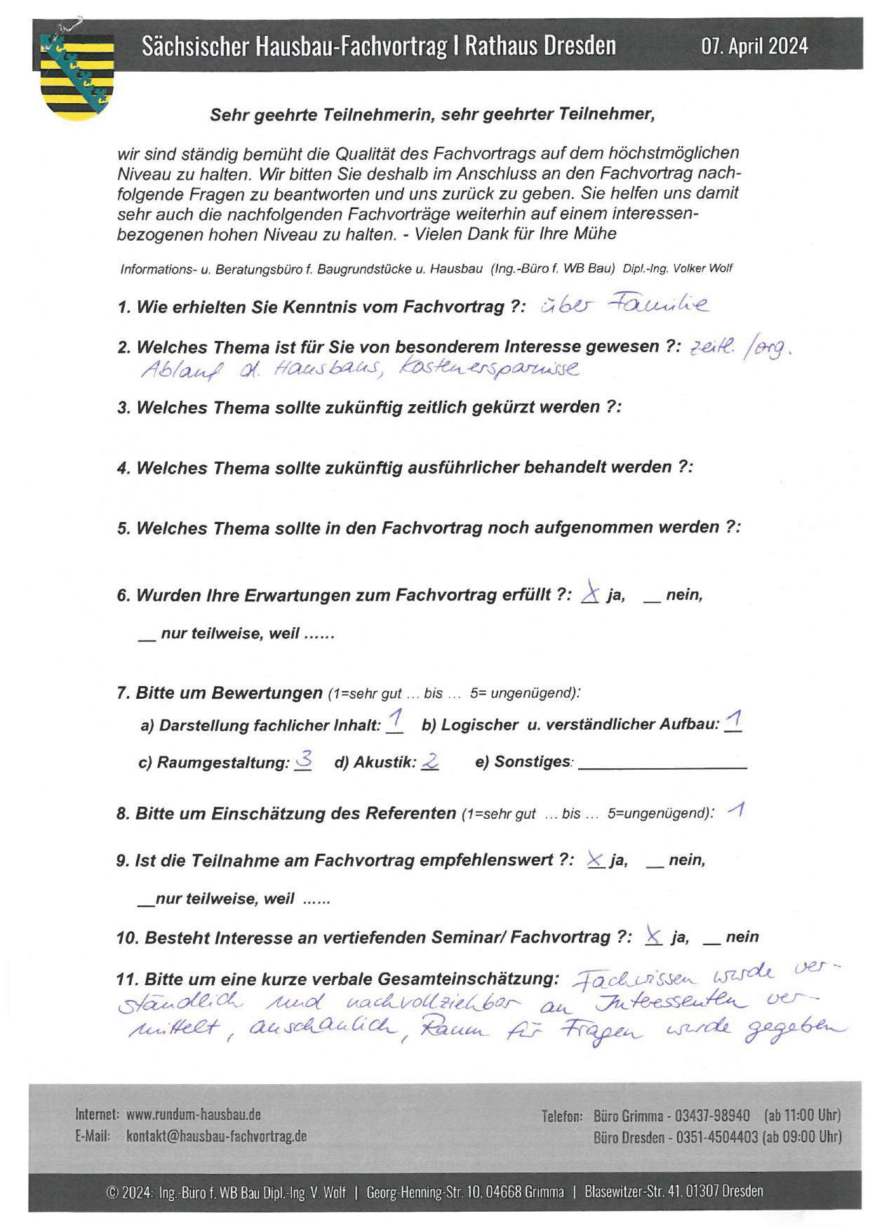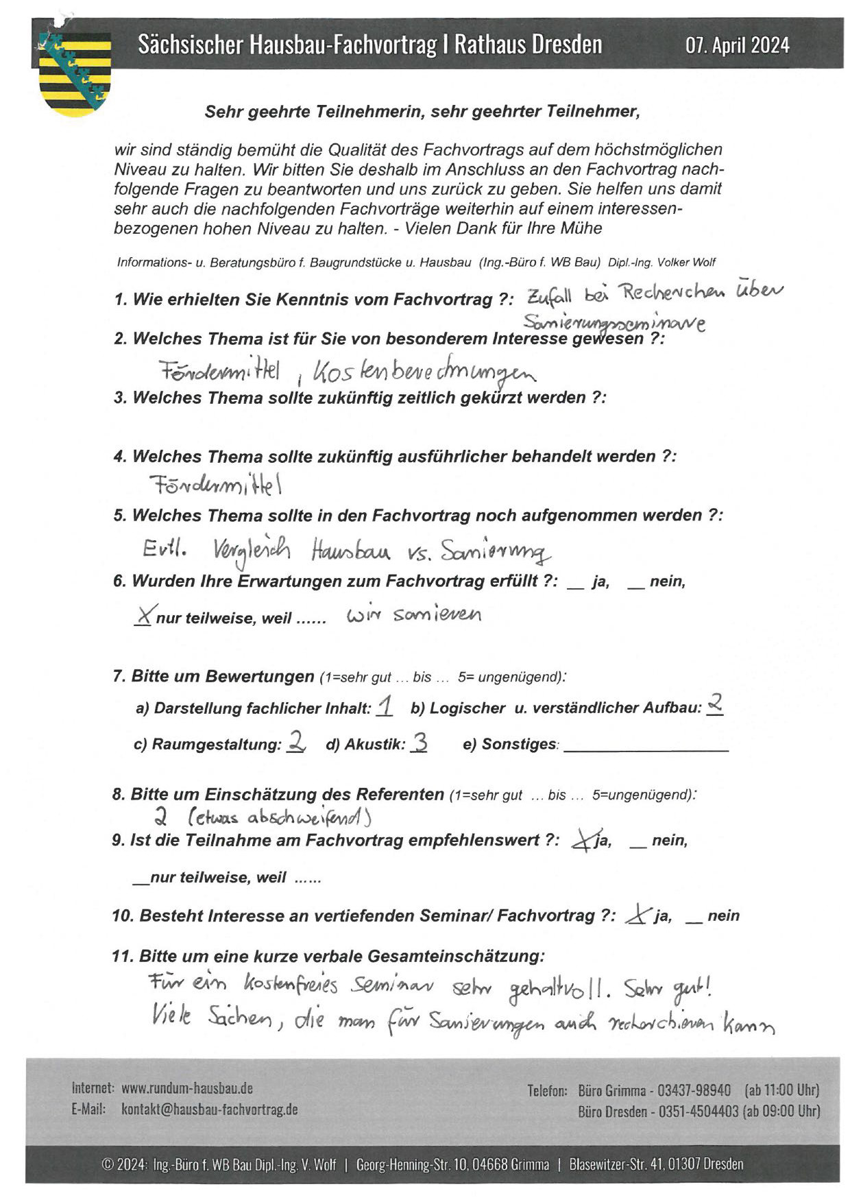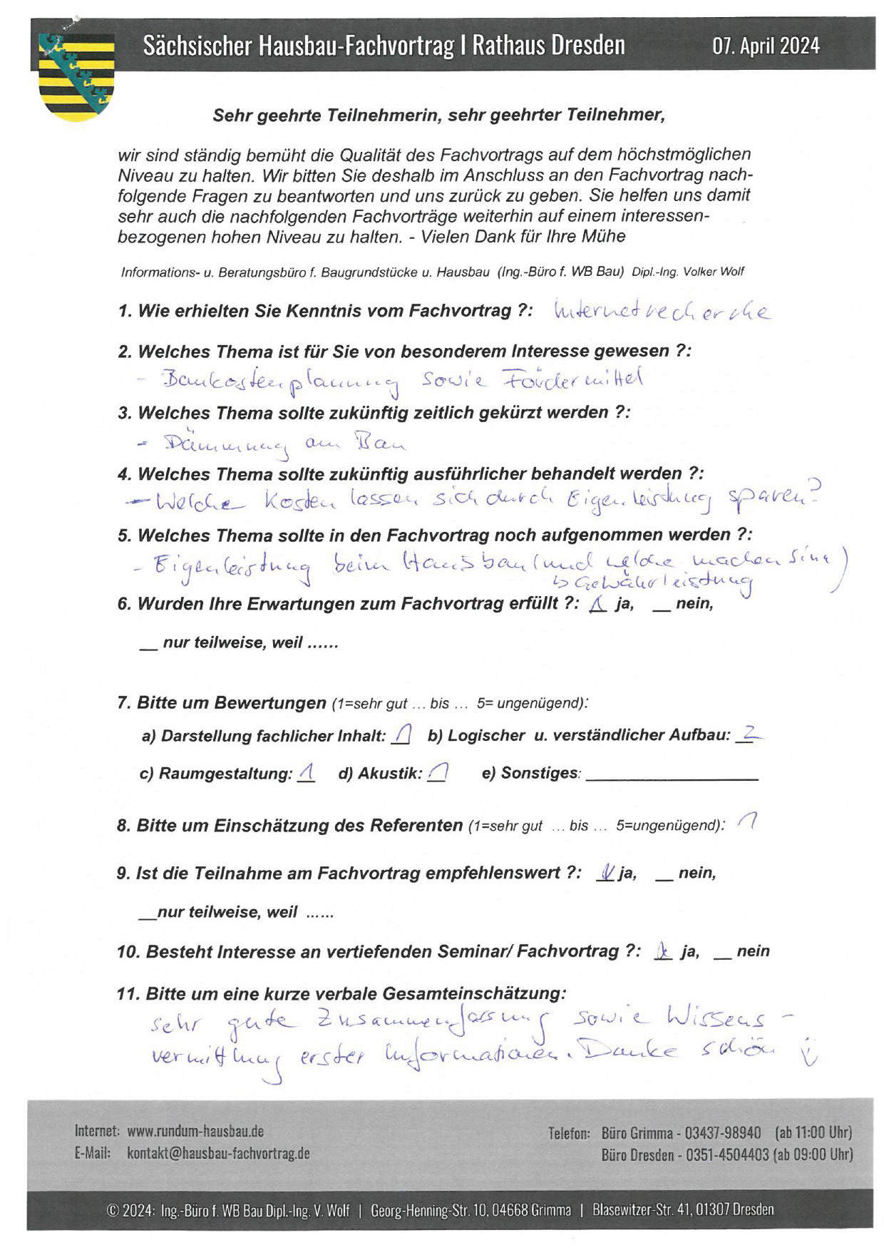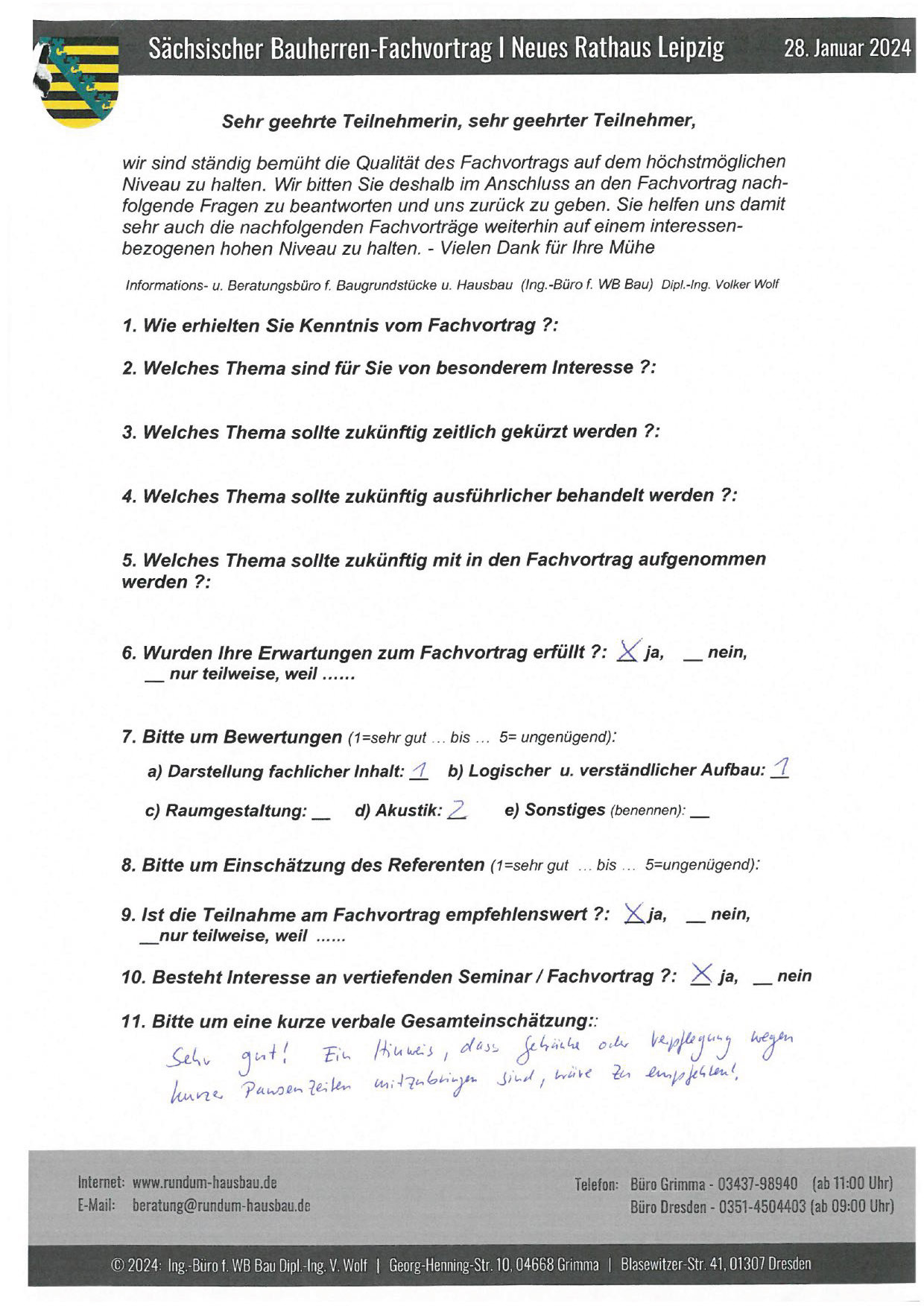 Den Hausbau-Fachvortrag von Herrn Dipl.-Ing. V. Wolf besuchte ich im März 2003 im Leipziger Rathaus. Der Andrang war so groß, dass zusätzliche Stühle aufgestellt werden mussten. Gleich am Anfang wurde mit den Teilnehmern abgestimmt, welche Themen intensiver behandelt werden sollen. Da ich ohne Vorkenntnisse die Veranstaltung besuchte, waren für mich die meisten Themen interessant.