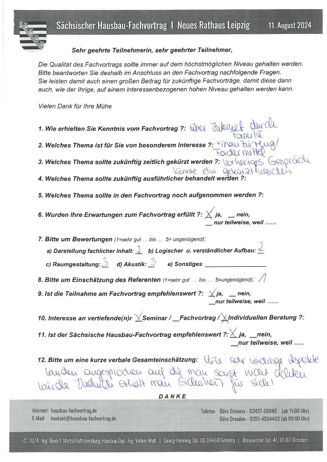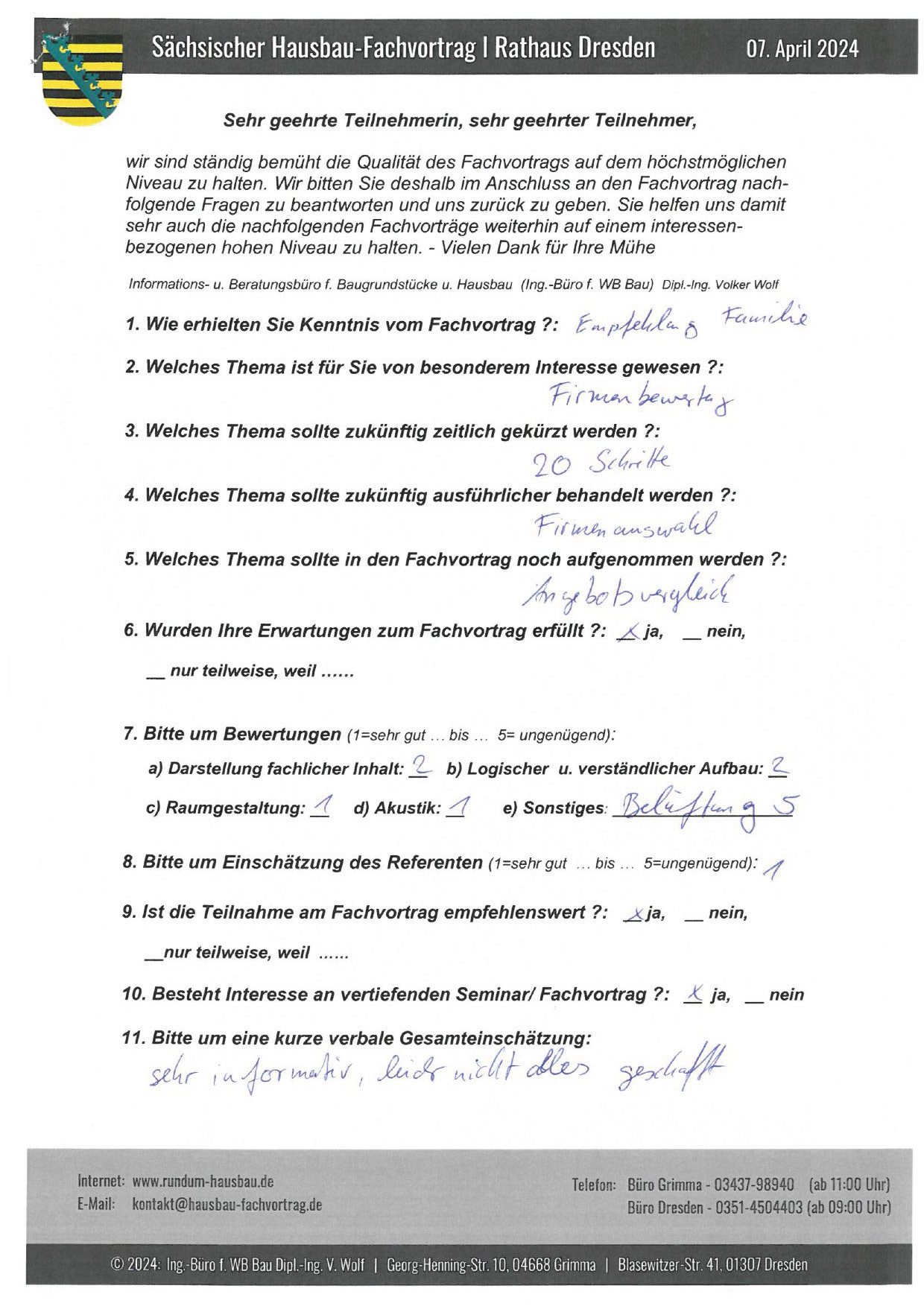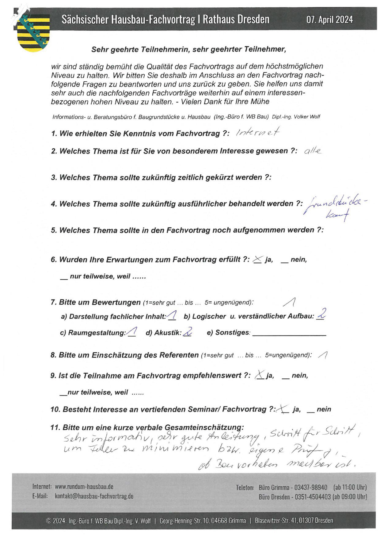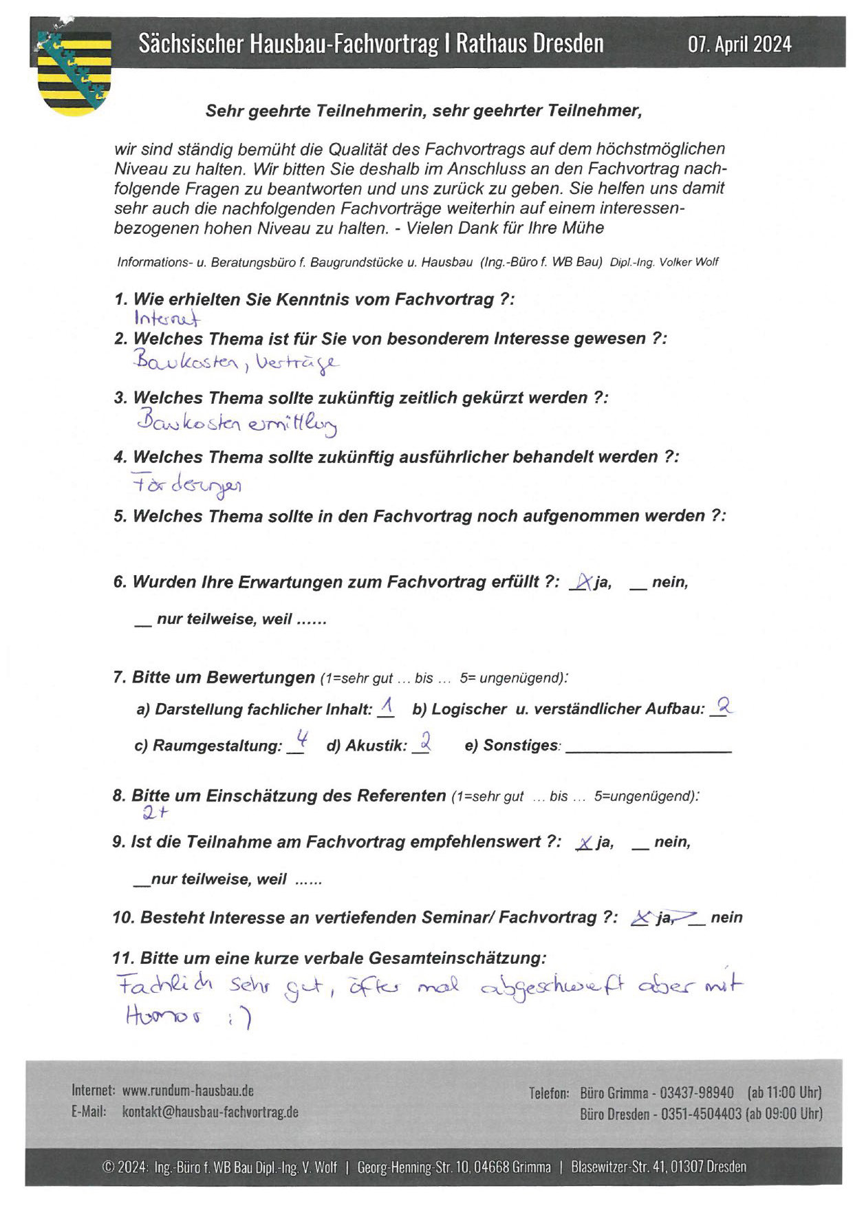 Den Hausbau-Fachvortrag von Herrn Dipl.-Ing. V. Wolf besuchte ich im März 2003 im Leipziger Rathaus. Der Andrang war so groß, dass zusätzliche Stühle aufgestellt werden mussten. Gleich am Anfang wurde mit den Teilnehmern abgestimmt, welche Themen intensiver behandelt werden sollen. Da ich ohne Vorkenntnisse die Veranstaltung besuchte, waren für mich die meisten Themen interessant.