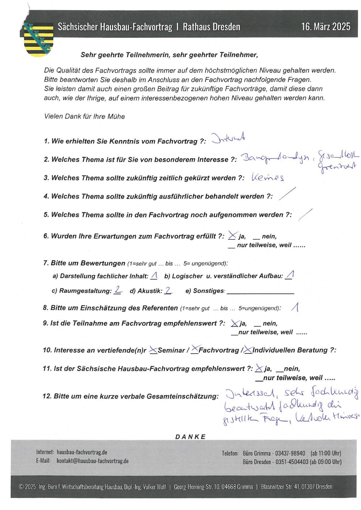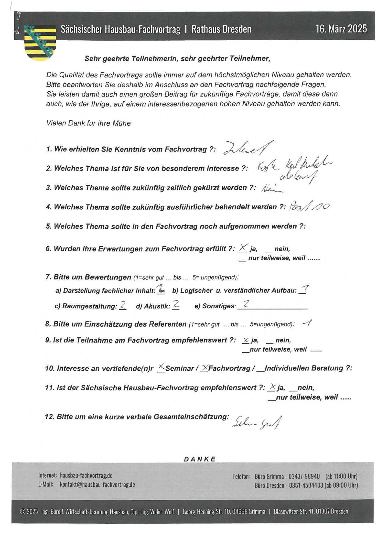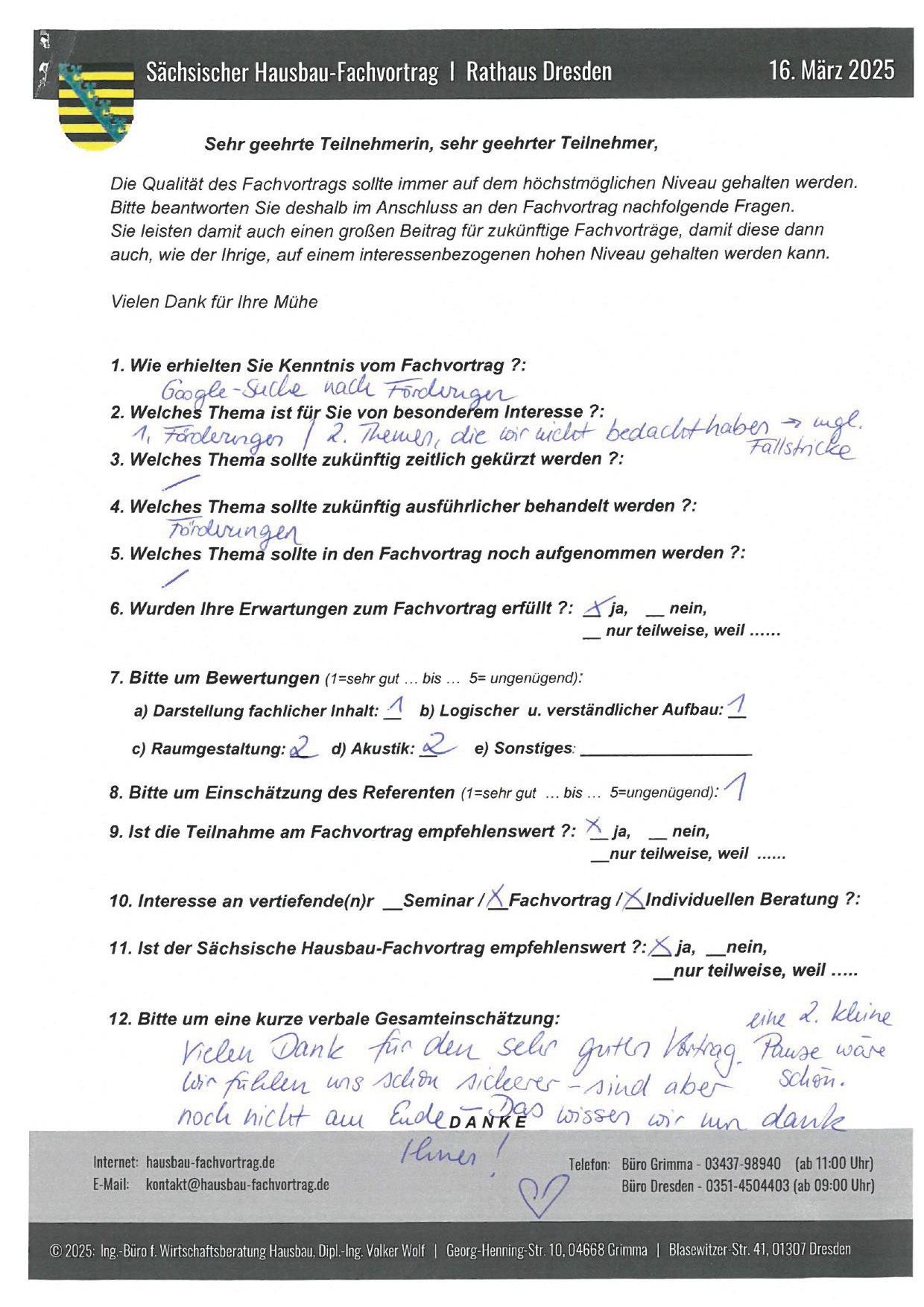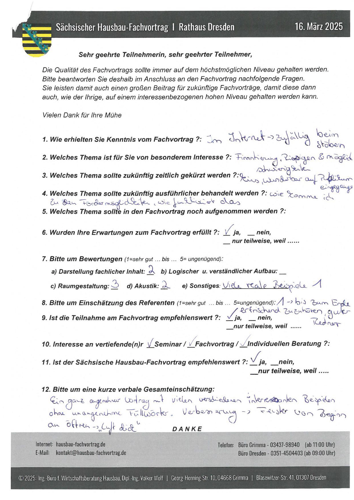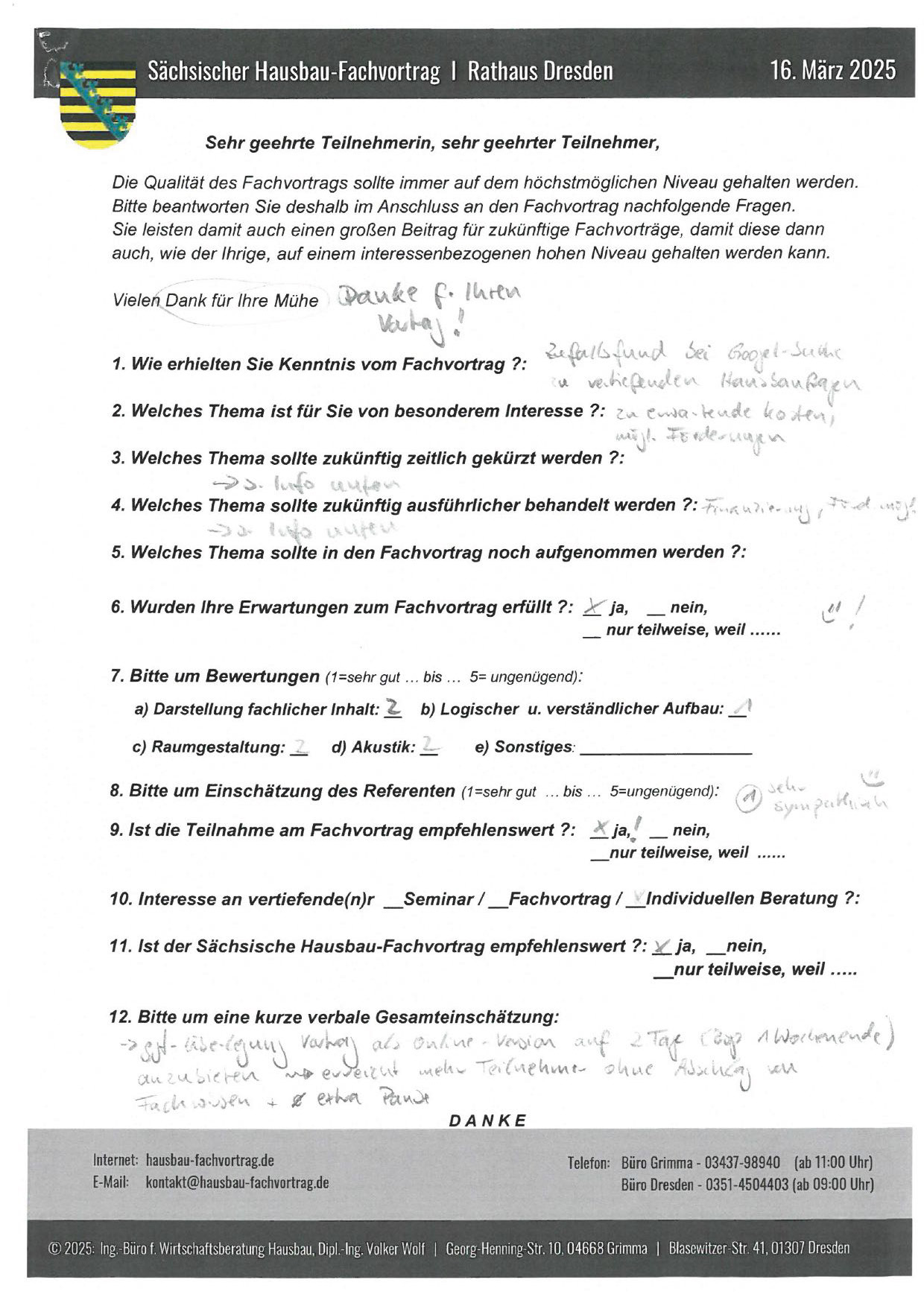 Zahlreiche dankbare und Hinweis gebende Rückmeldungen ehemaliger Teilnehmer am „Sächsischen Hausbau-Fachvortrag“ sind nicht nur Anerkennung für Getanes, sondern auch treibende Kraft für die Gestaltung zukünftiger Fachvorträge.