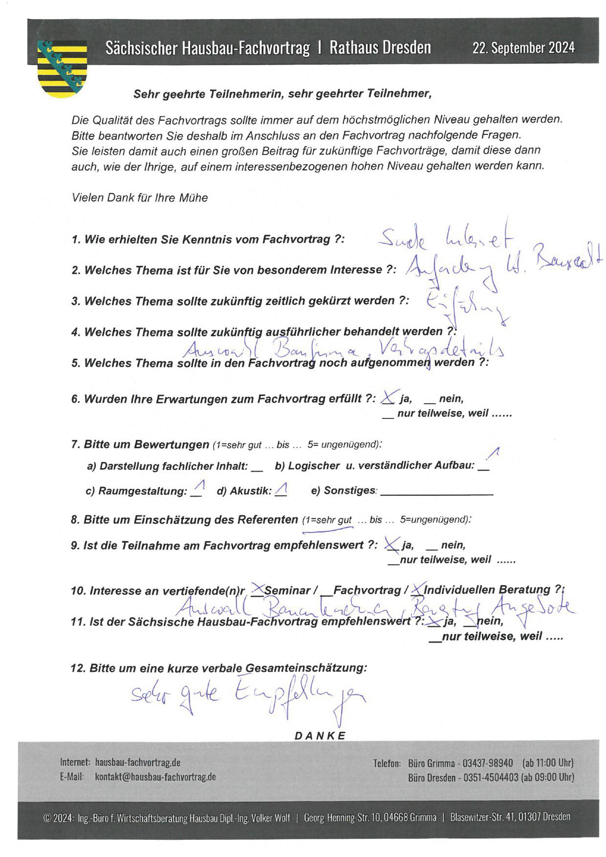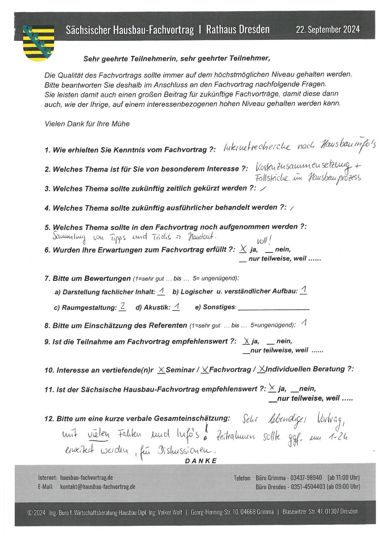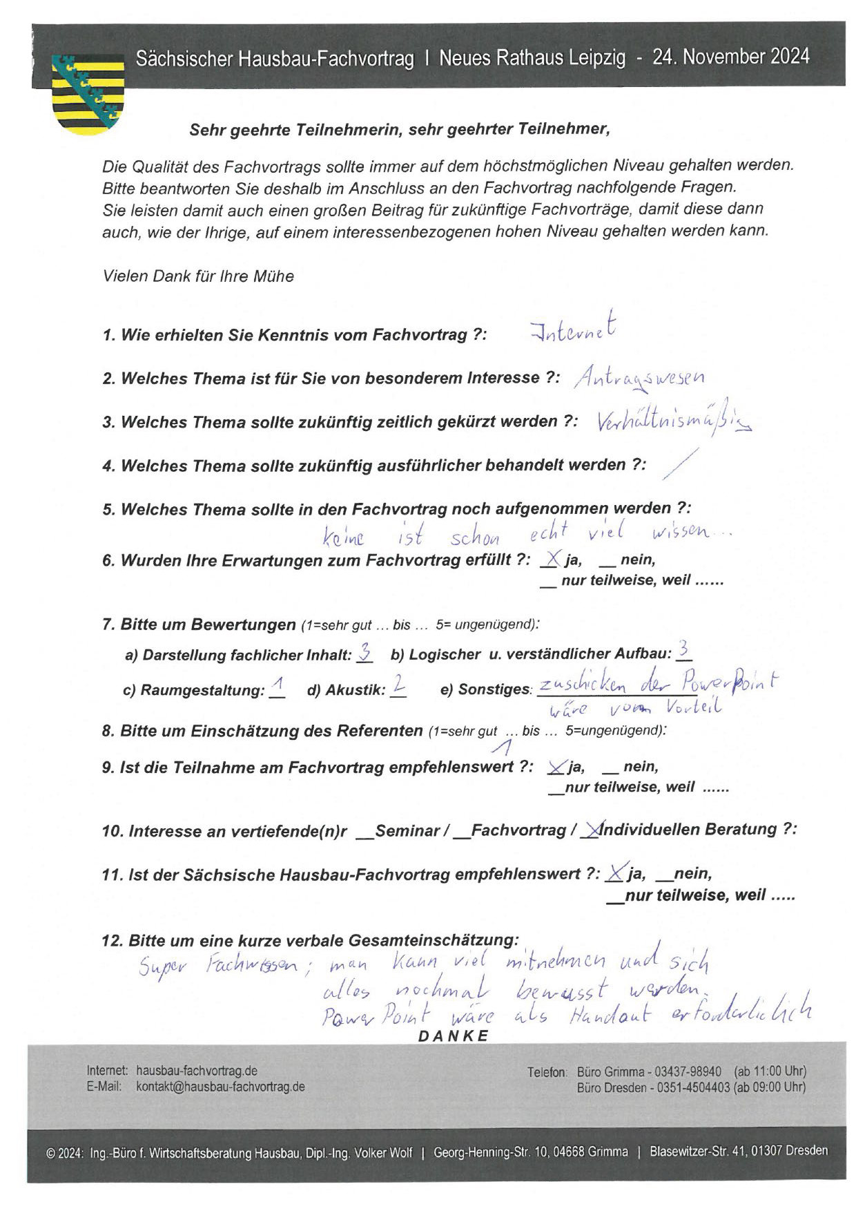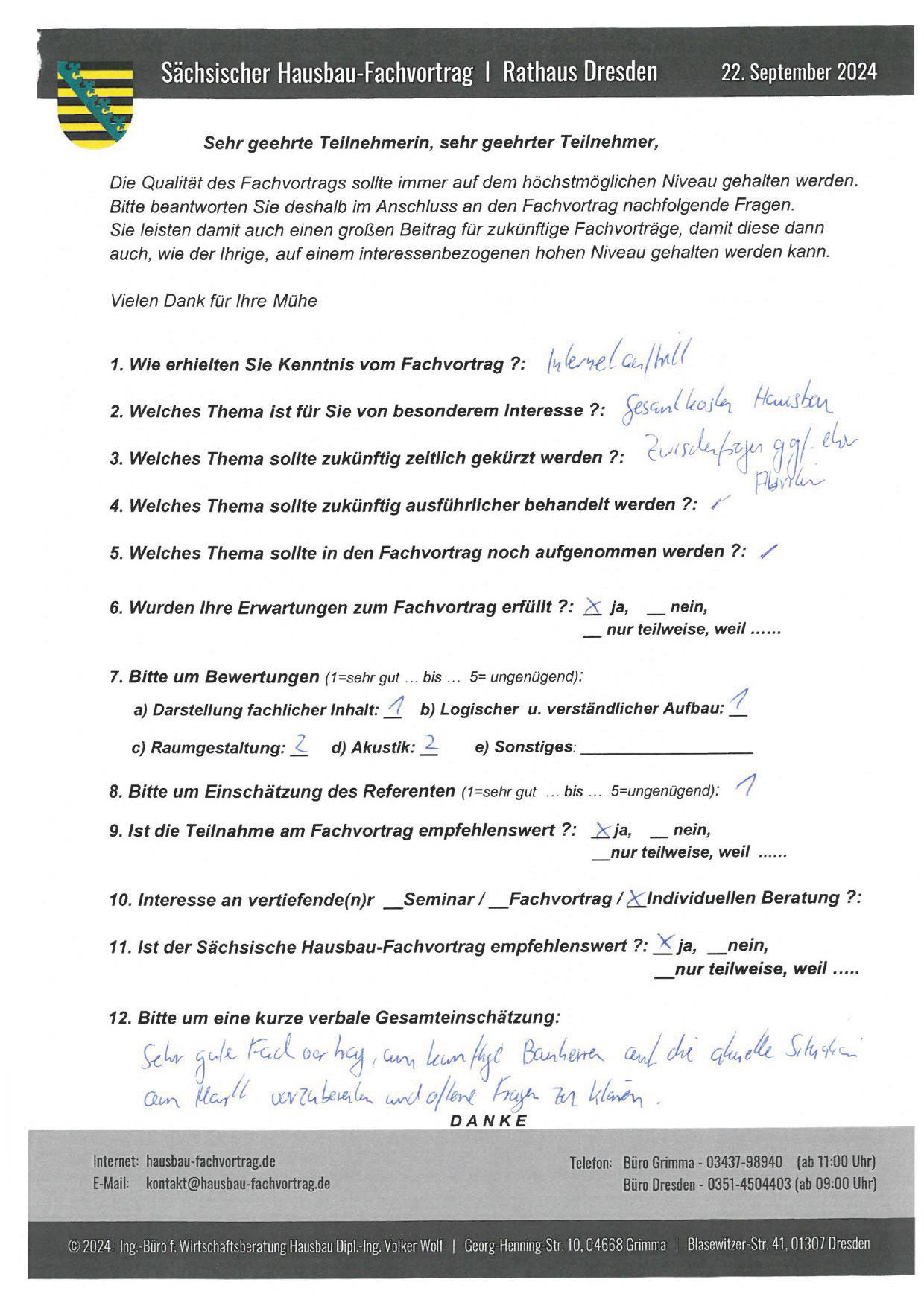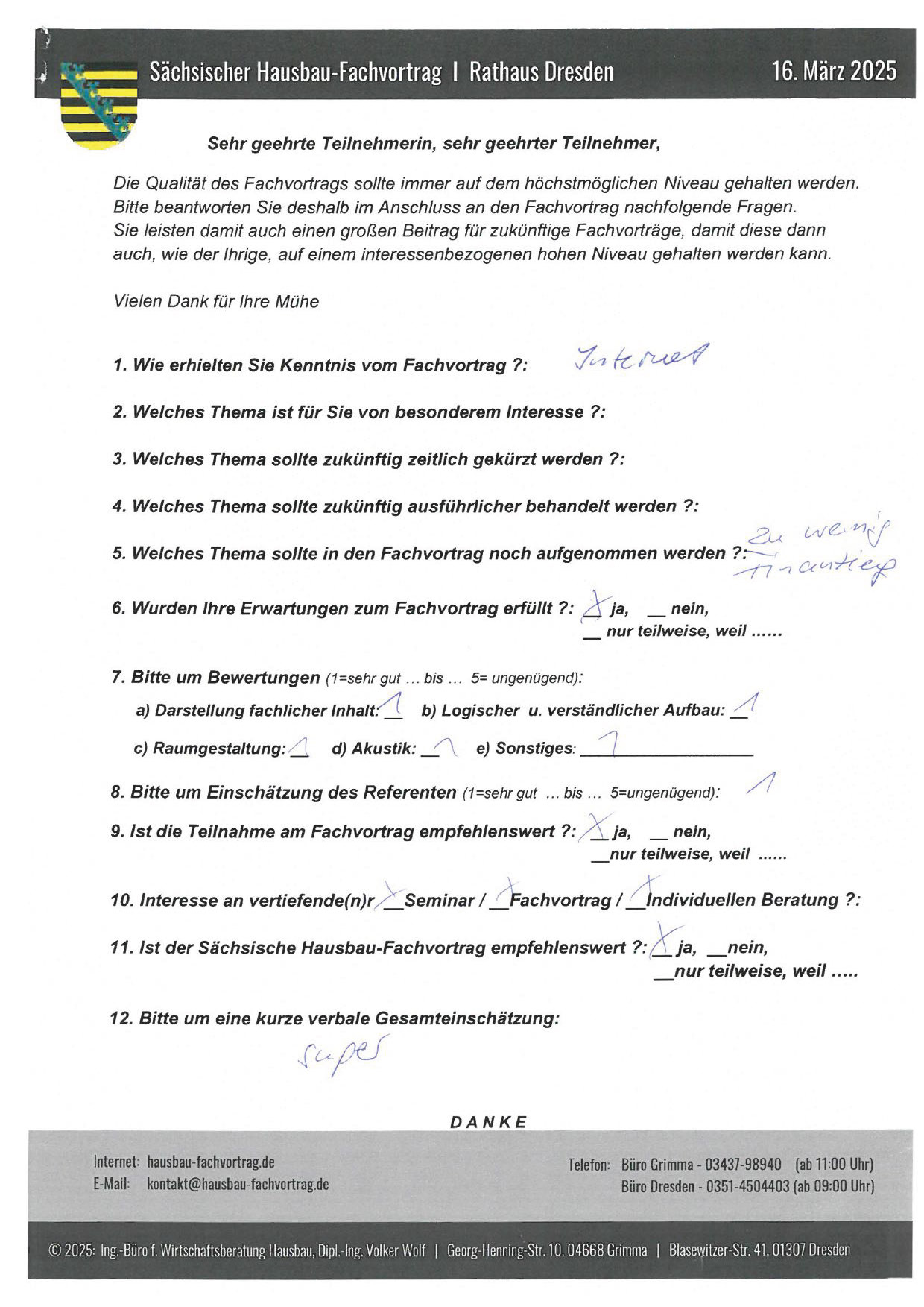 Zahlreiche dankbare und Hinweis gebende Rückmeldungen ehemaliger Teilnehmer am „Sächsischen Hausbau-Fachvortrag“ sind nicht nur Anerkennung für Getanes, sondern auch treibende Kraft für die Gestaltung zukünftiger Fachvorträge.