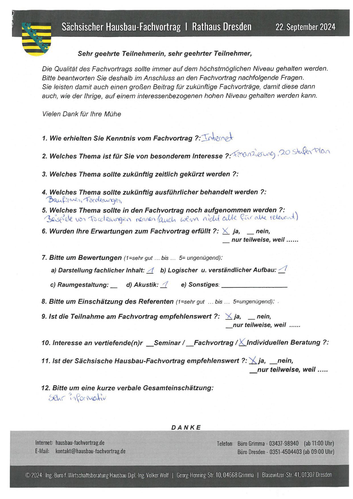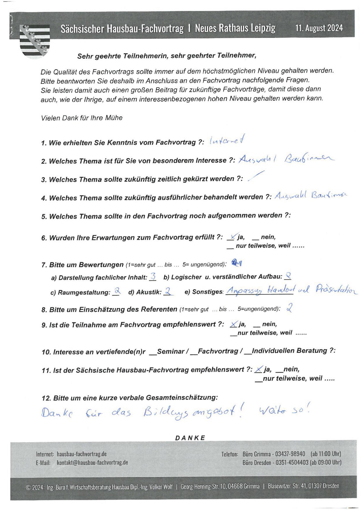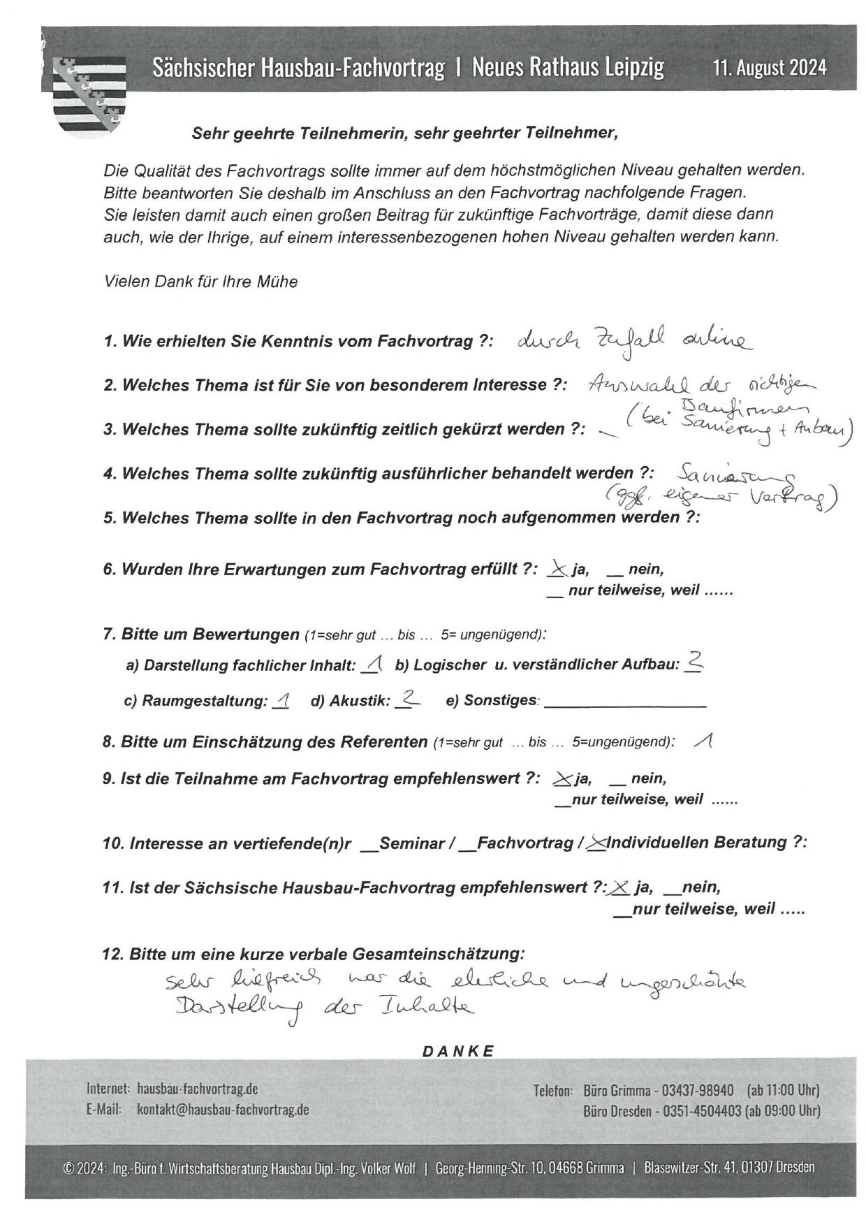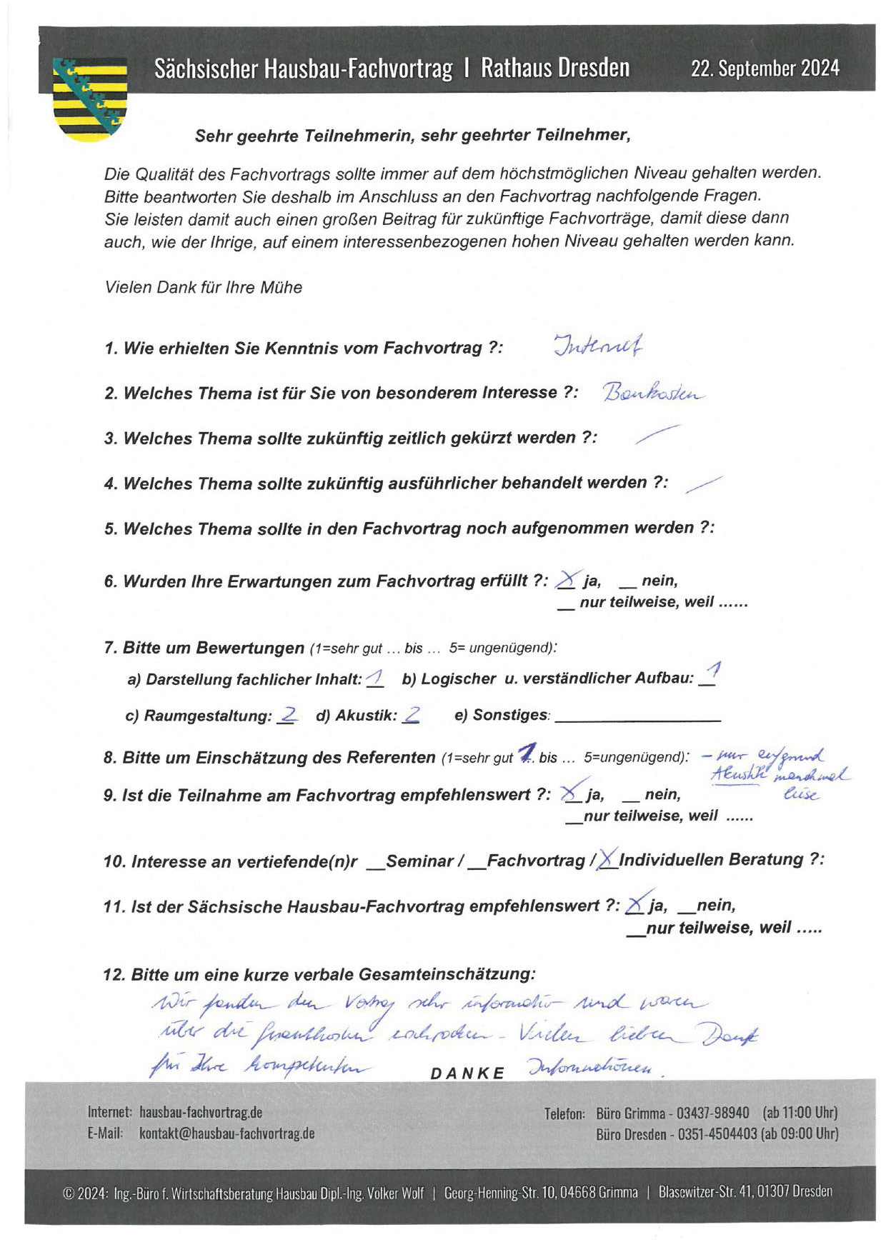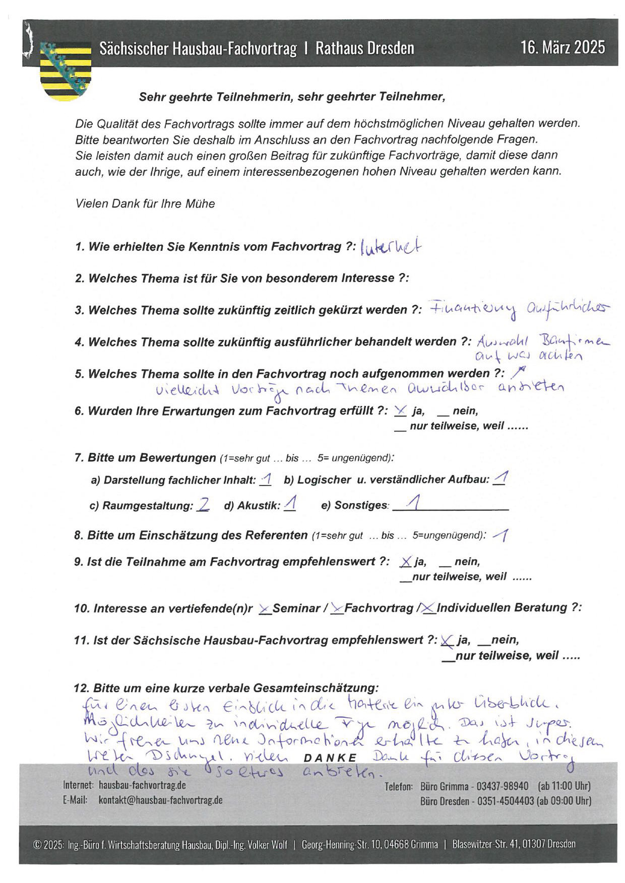Zahlreiche dankbare und Hinweis gebende Rückmeldungen ehemaliger Teilnehmer am „Sächsischen Hausbau-Fachvortrag“ sind nicht nur Anerkennung für Getanes, sondern auch treibende Kraft für die Gestaltung zukünftiger Fachvorträge.