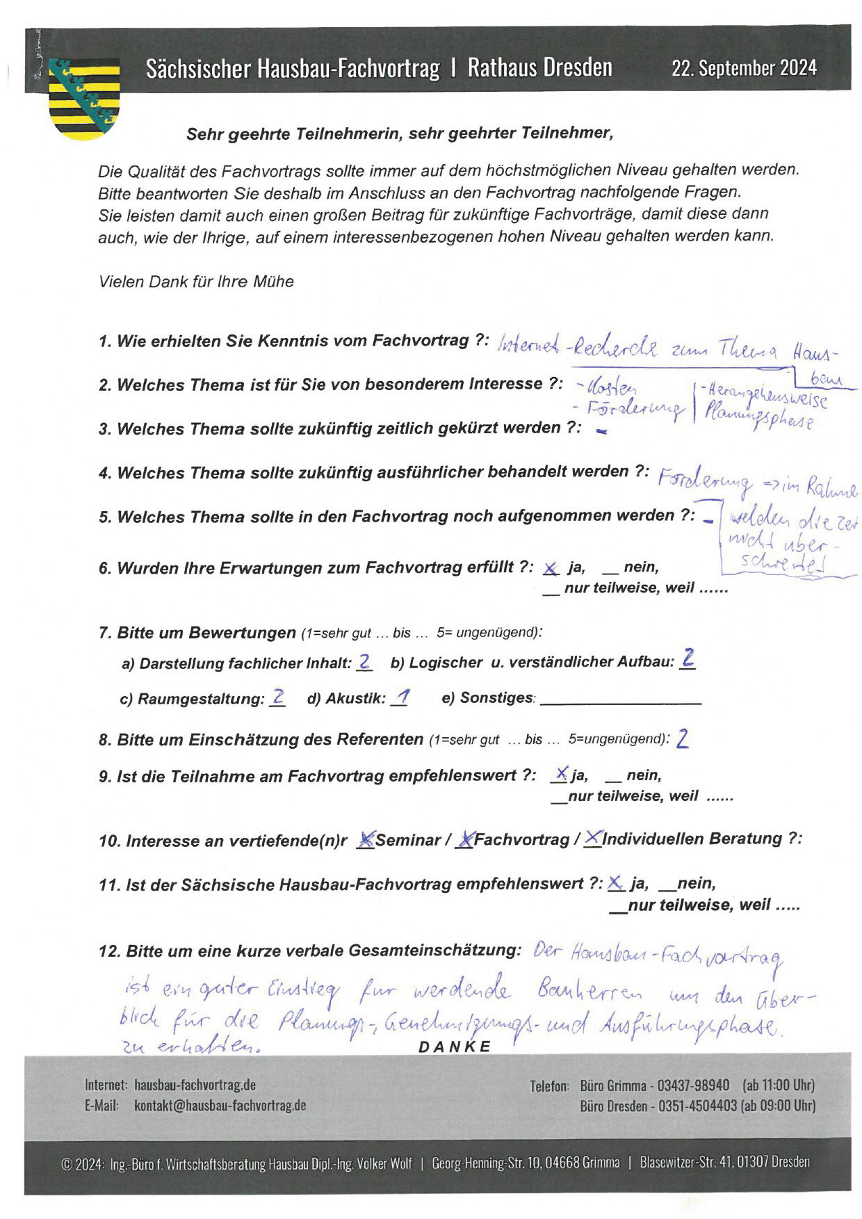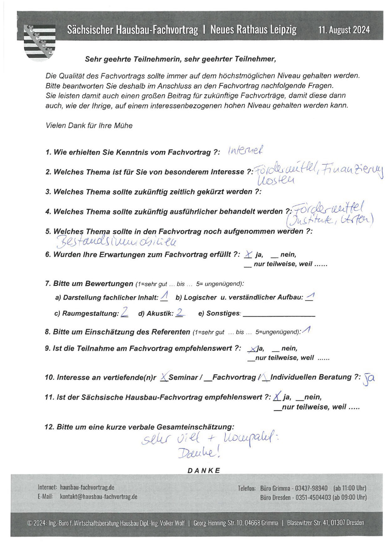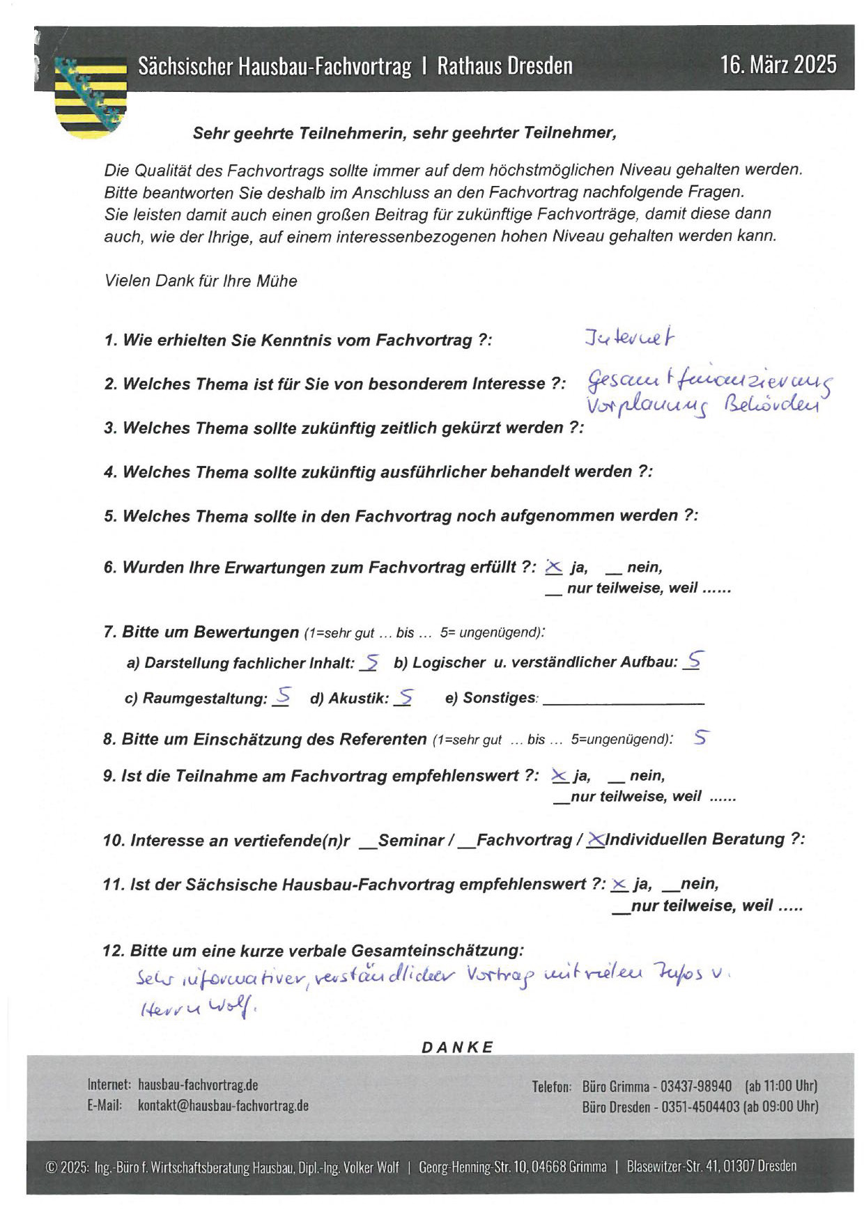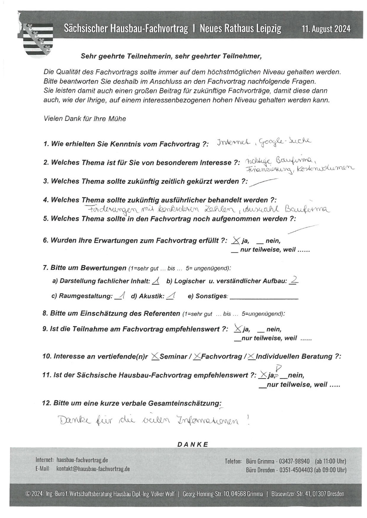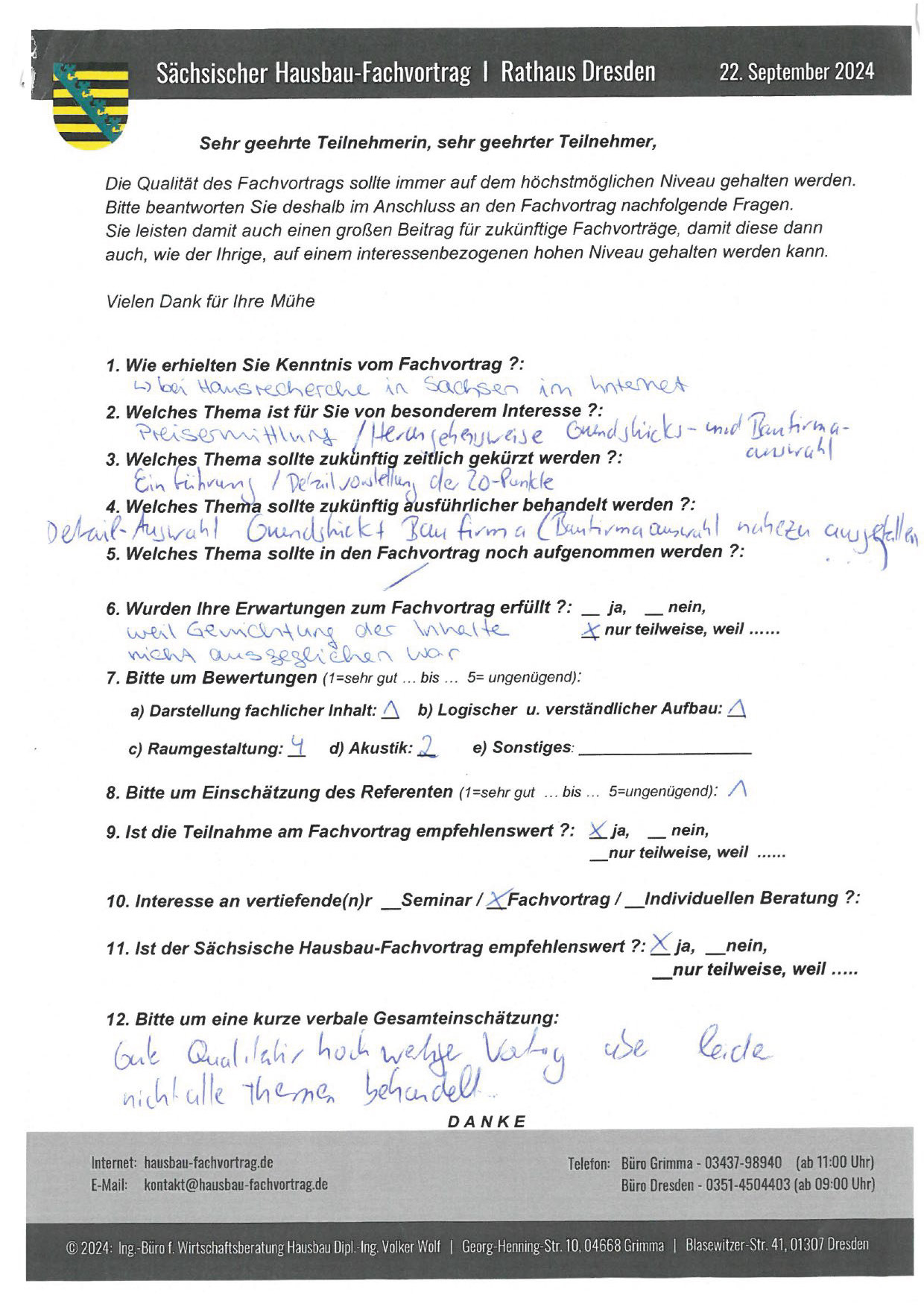 Zahlreiche dankbare und Hinweis gebende Rückmeldungen ehemaliger Teilnehmer am „Sächsischen Hausbau-Fachvortrag“ sind nicht nur Anerkennung für Getanes, sondern auch treibende Kraft für die Gestaltung zukünftiger Fachvorträge.