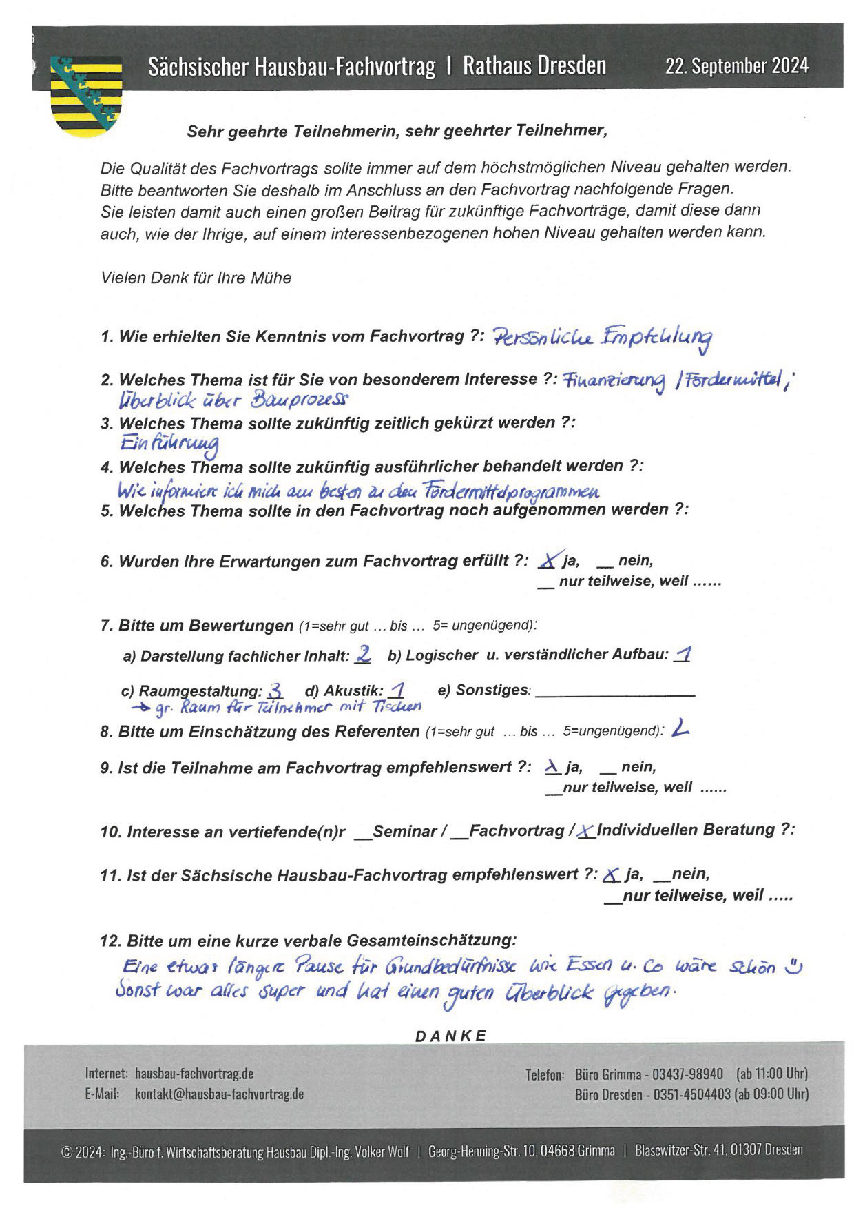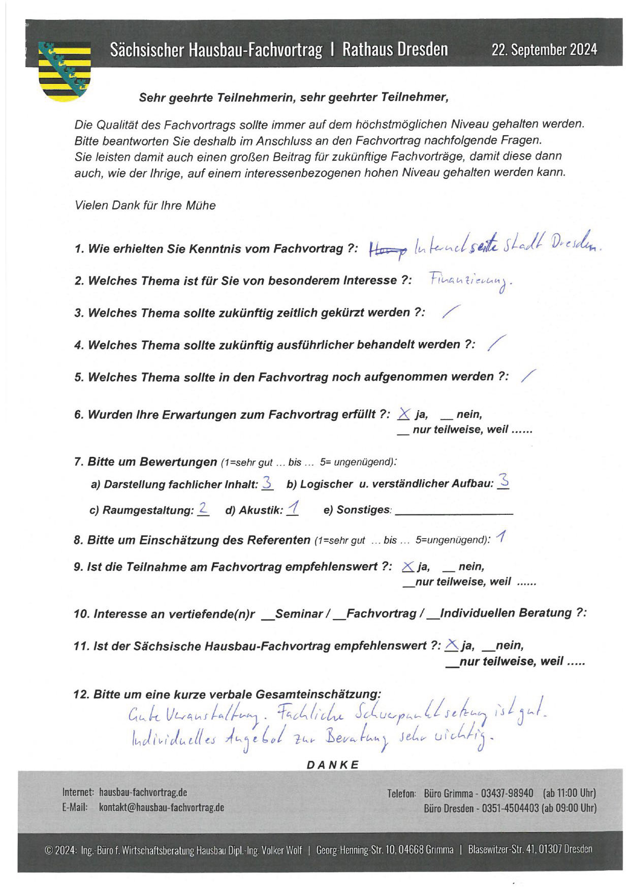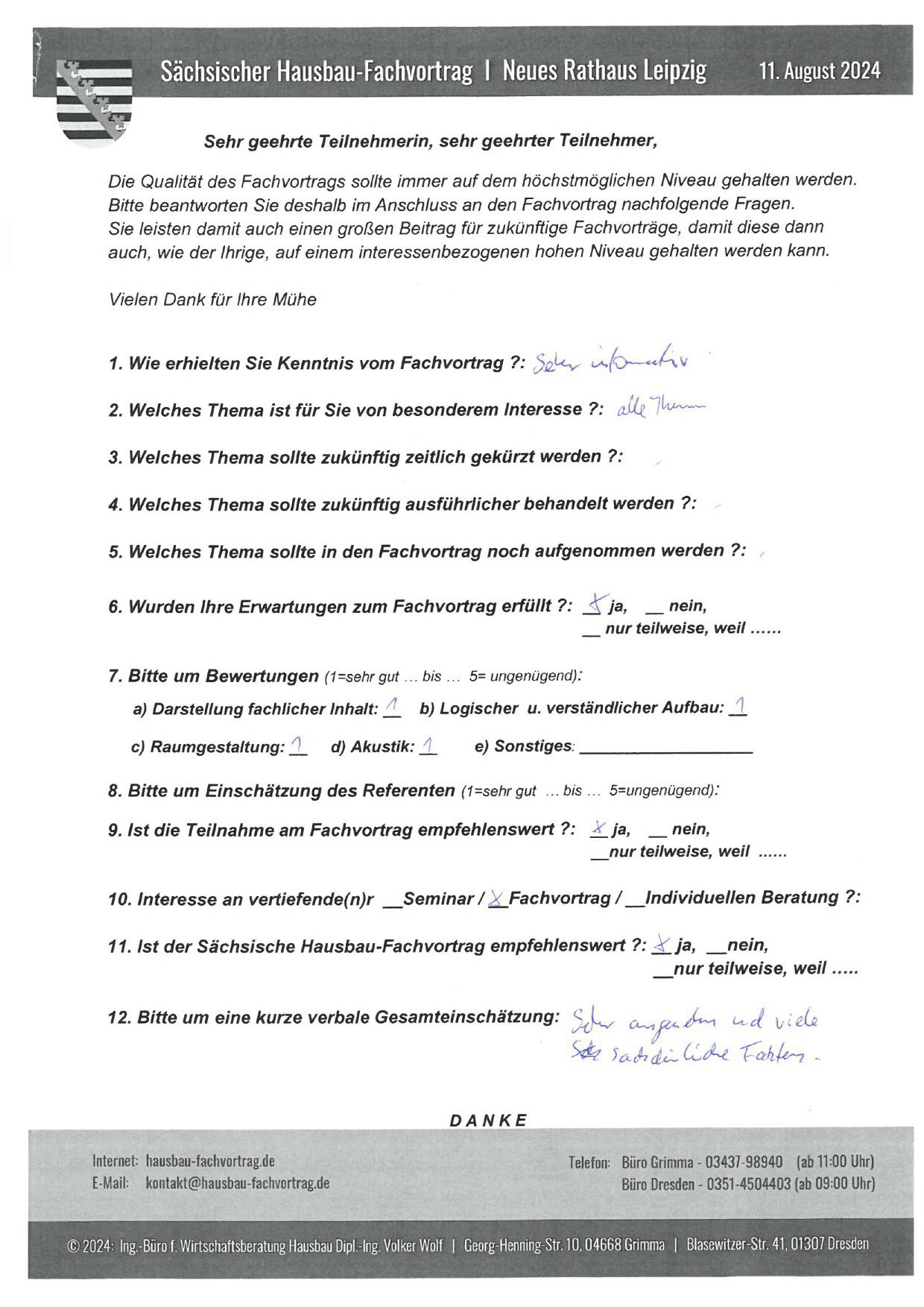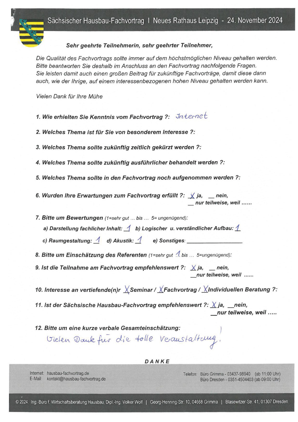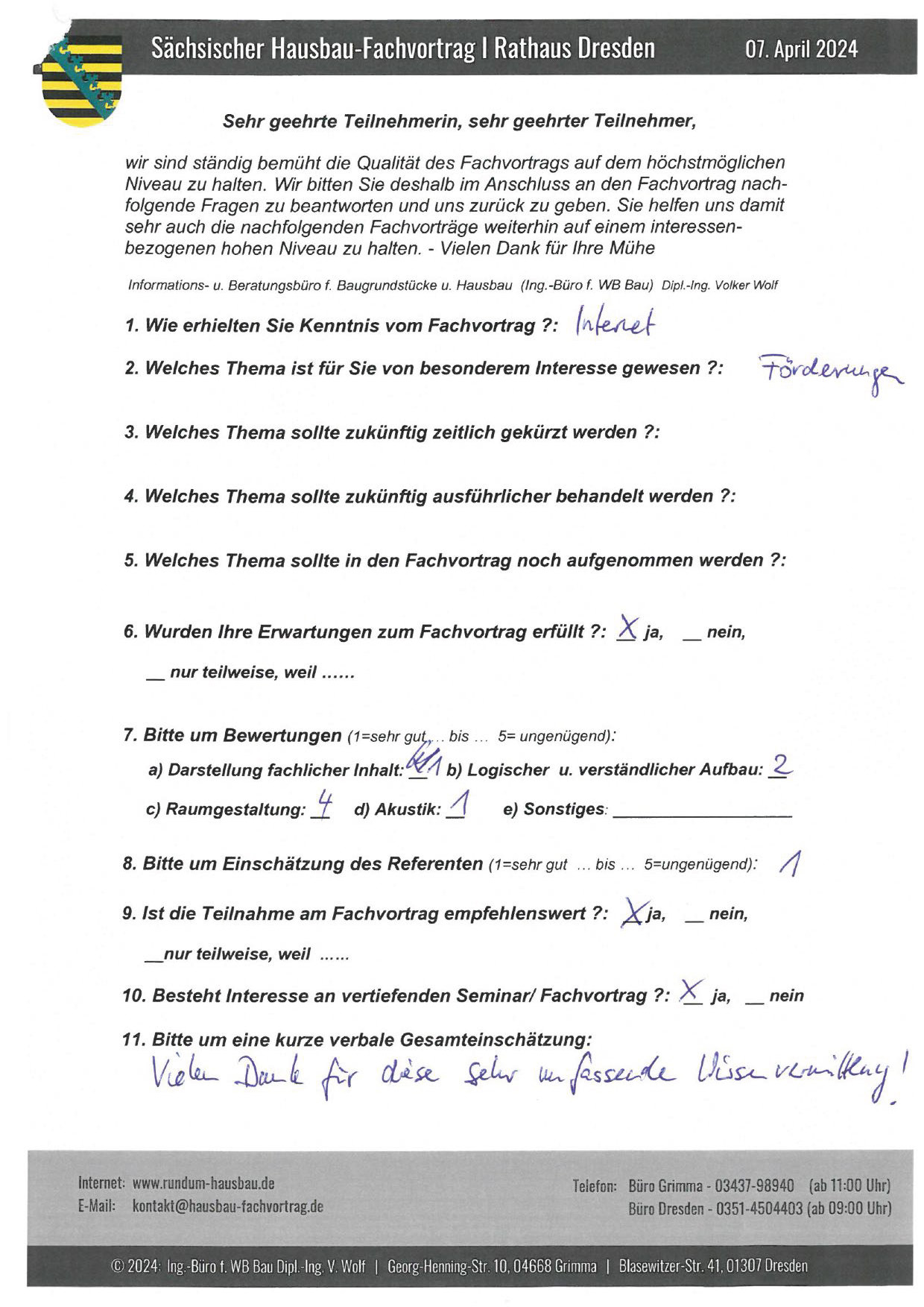 Zahlreiche dankbare und Hinweis gebende Rückmeldungen ehemaliger Teilnehmer am „Sächsischen Hausbau-Fachvortrag“ sind nicht nur Anerkennung für Getanes, sondern auch treibende Kraft für die Gestaltung zukünftiger Fachvorträge.