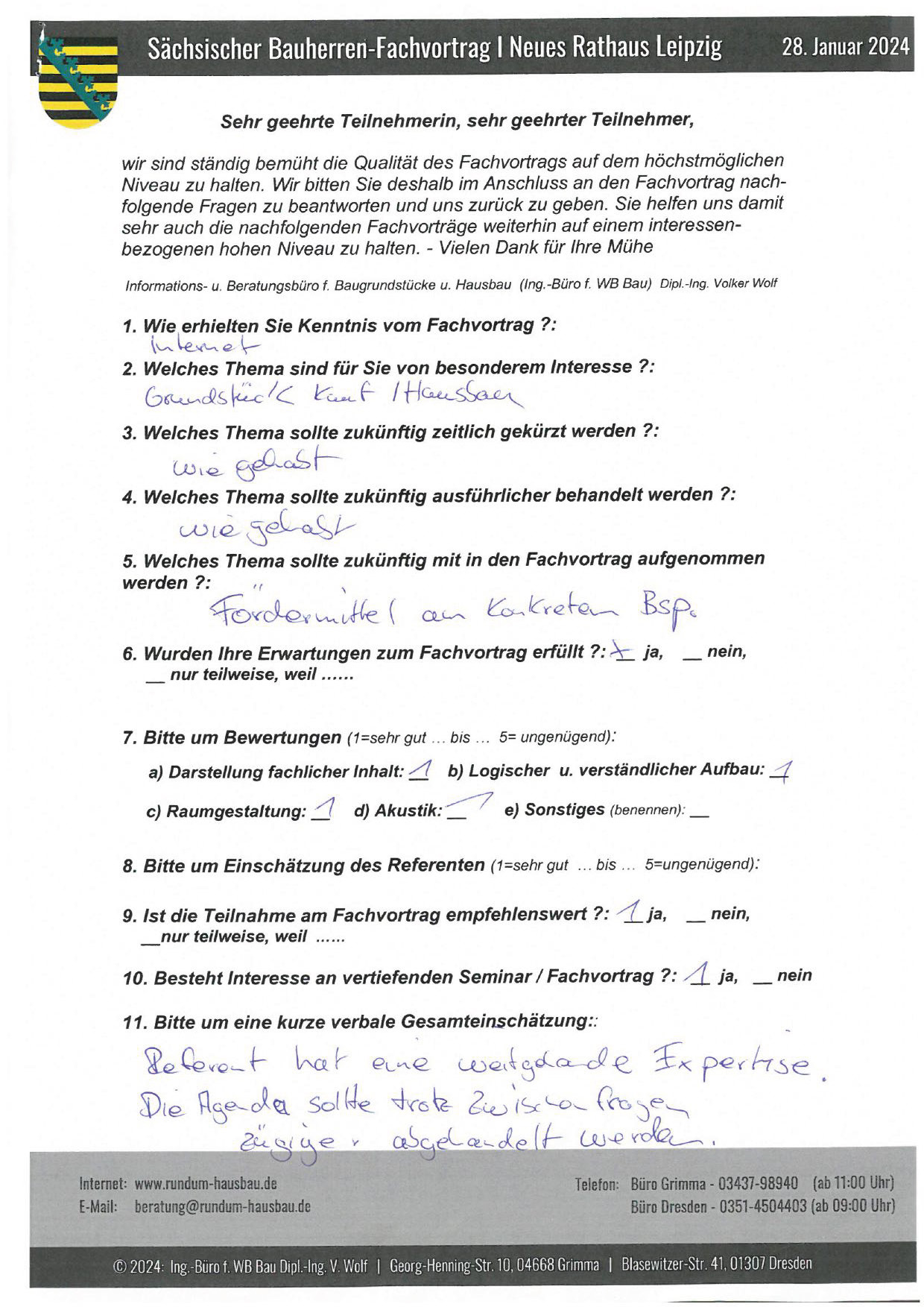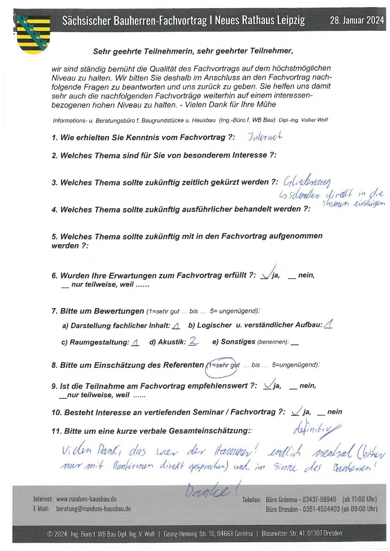 Zu dieser Zeit entdeckten wir im Leipziger Amtsblatt einen Hinweis zu einem Fachvortrag der in seminaristischer Form für zukünftige Bauherren im Neuen Rathaus Leipzig von Herrn Dipl.-Ing. Volker Wolf gehalten wird.